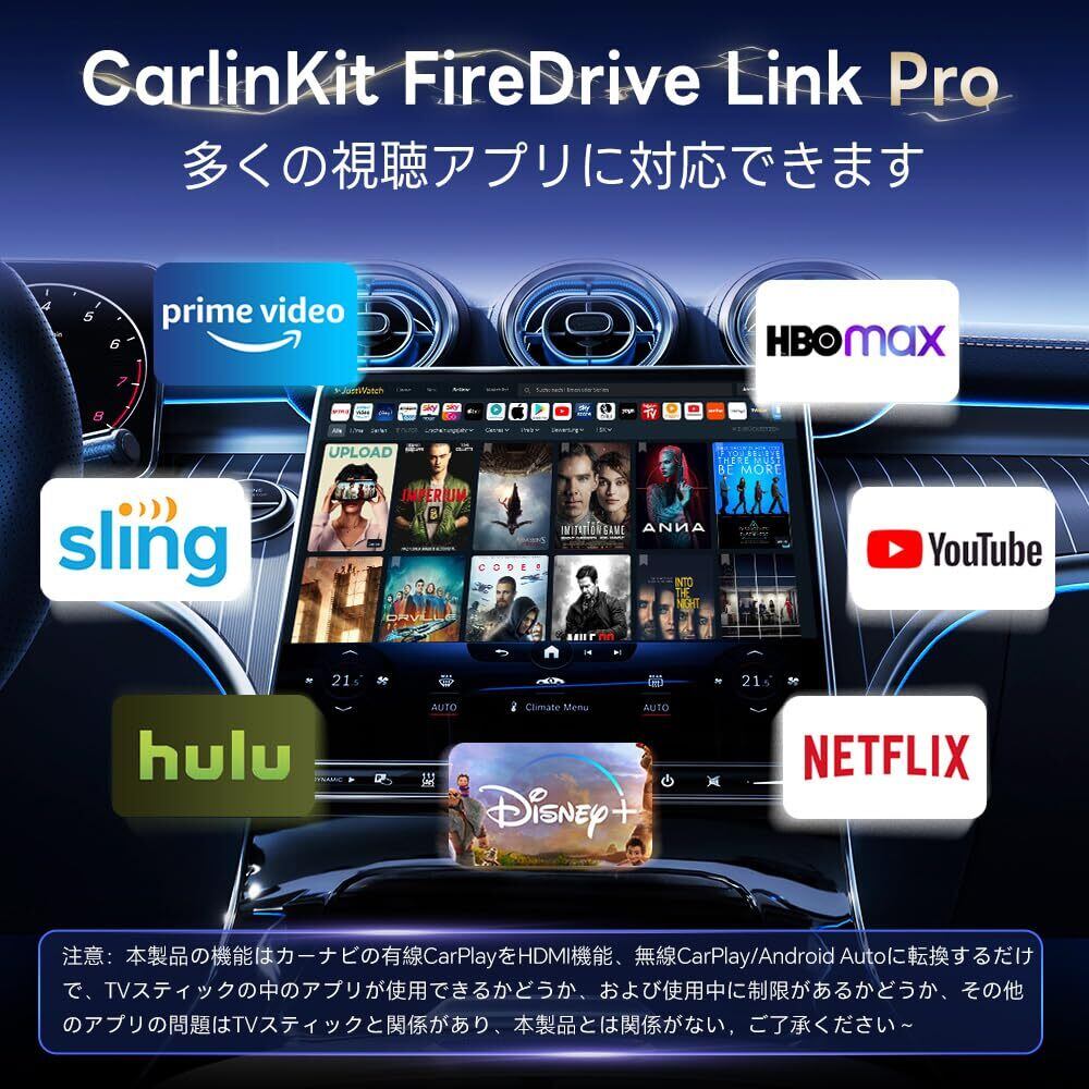 【新品CarlinKit FireDrive Link Pro登場】:FireDrive Link Proは純正な有線CarPlayが内蔵される車種(非サードパーティのアンドロイドカーナビ)に対応可能です。Fire TV Stick専用設計に無線CarPlay&無線Android Auto機能を追加し、簡単に動画再生、ワイヤレスCarPlayAndroid Autoが実現できます。また、Youtube、Netflixなどの動画視聴アプリに対応でき、ニュースやドラマ、バラエティー番組、アニメなど色々なビデオを車画面に再生できます。2Kまでの高解像度をサポートし、HDの視覚体験を提供します。一方、製品の外観は複数のFire TV Stickモデルと互換性があり、複数のHDMI デバイスへのアクセスをサポートします。OTAオンラインアップグレードもサポートします!