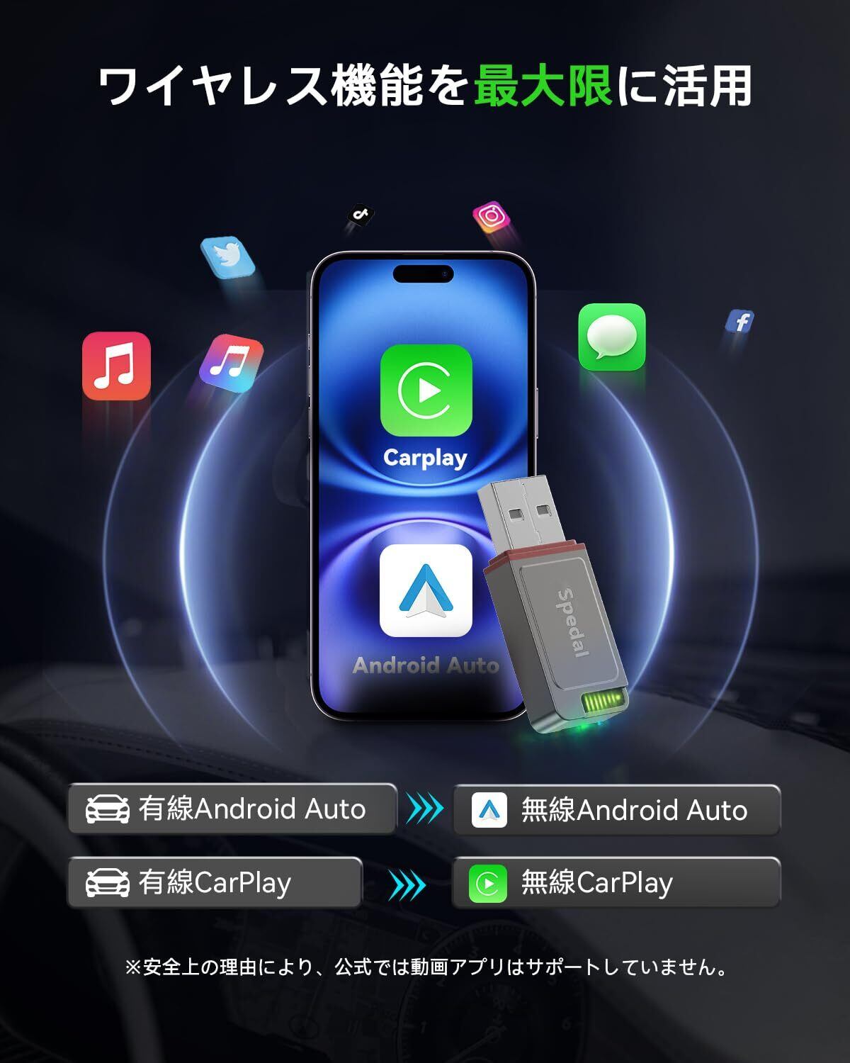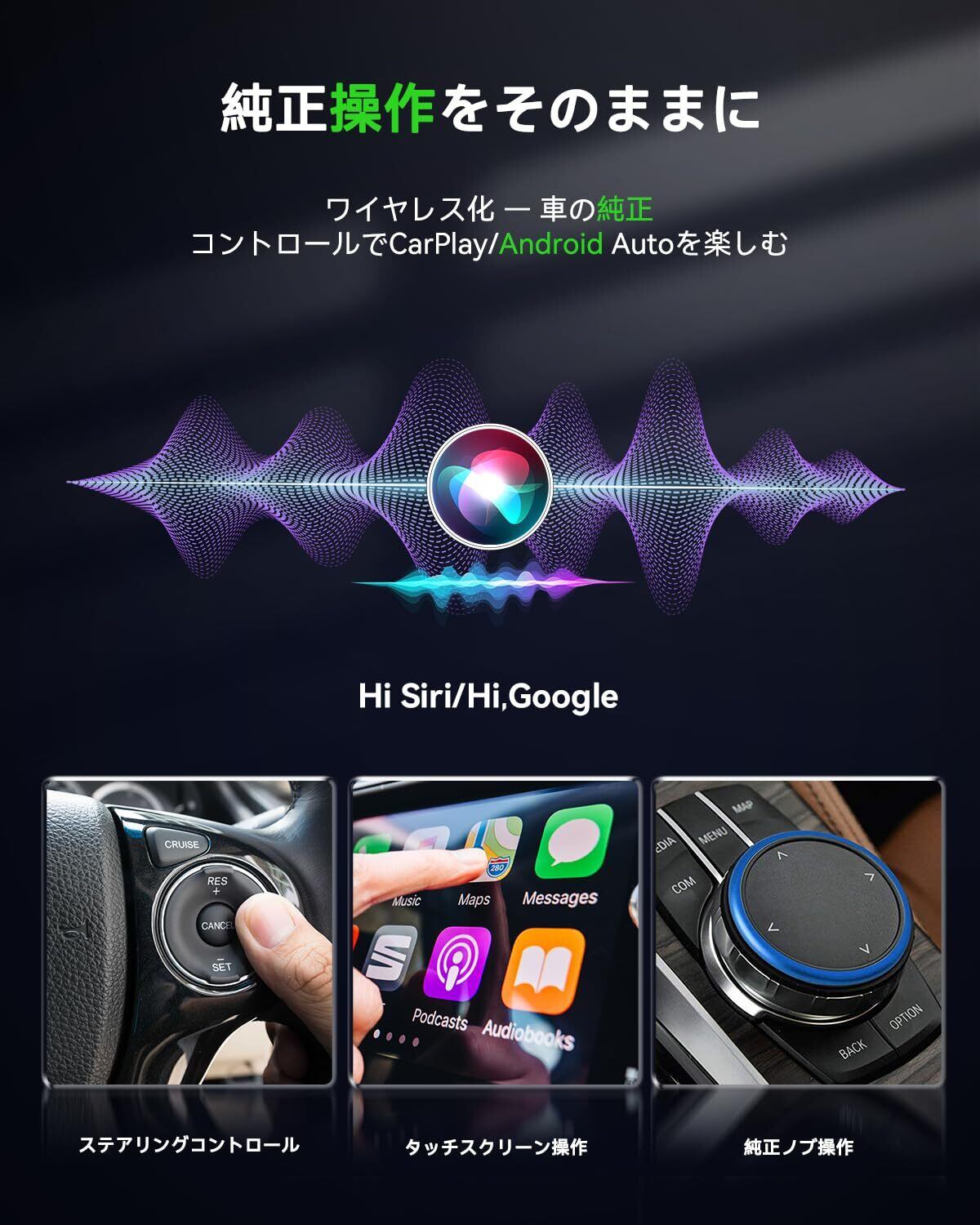【CarPlayおよびAndroid Auto対応】このデュアルユースのAndroid Auto CarPlay ワイヤレスアダプターは、2017年以降にOEMの有線CarPlayまたは有線Android Autoが搭載された車両に対応しています。元の有線CarPlayをApple CarPlay ワイヤレス化したり、Android AutoをAndroid Auto ワイヤレス化したりでき、面倒な作業は不要です。ナビゲーション、音楽再生、Siriアシスタント、電話などのCarPlayやAndroid Autoの機能をそのまま使い、車両の元の操作も維持できます。【ご注意ください:YouTubeおよびNetflixの動画は視聴できません】