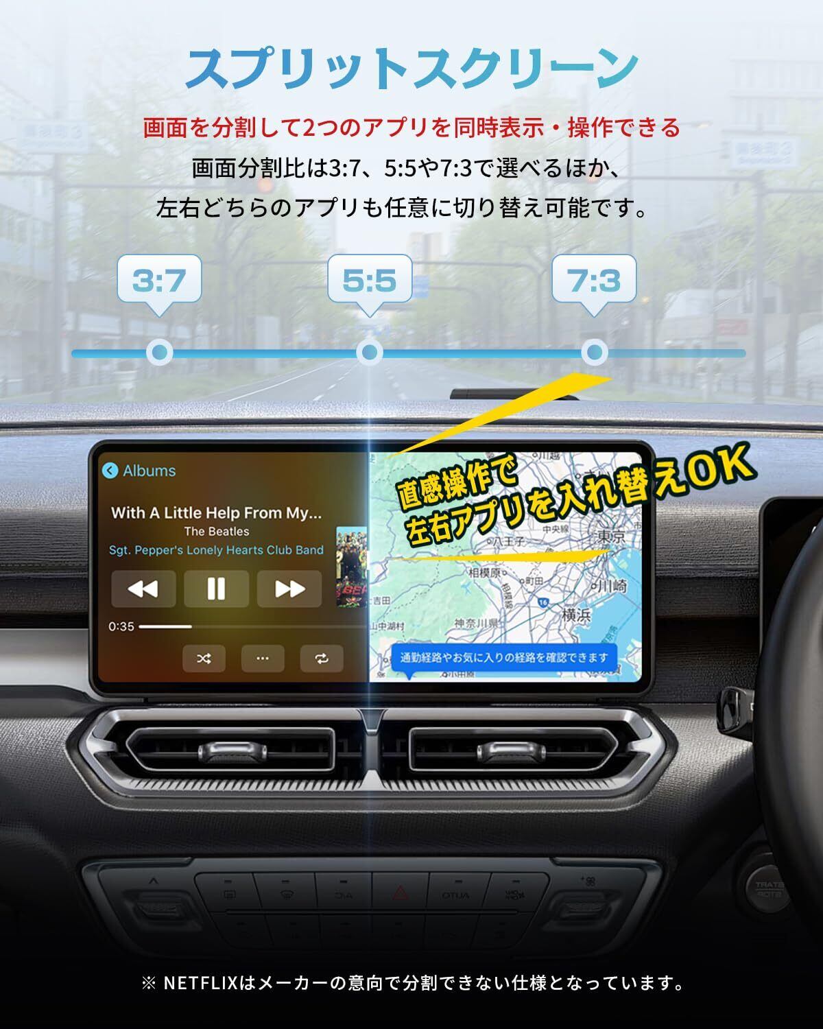 【マルチタスク対応のスプリットスクリーン機能】スプリットスクリーン機能により、ナビゲーションを使用しながら同時に動画視聴が可能です。画面の分割比は3:7、5:5、7:3の3種類から選べ、さらに左右のアプリを簡単に切り替えることもできるため、利便性が高く、ドライビング体験を一層快適にします。