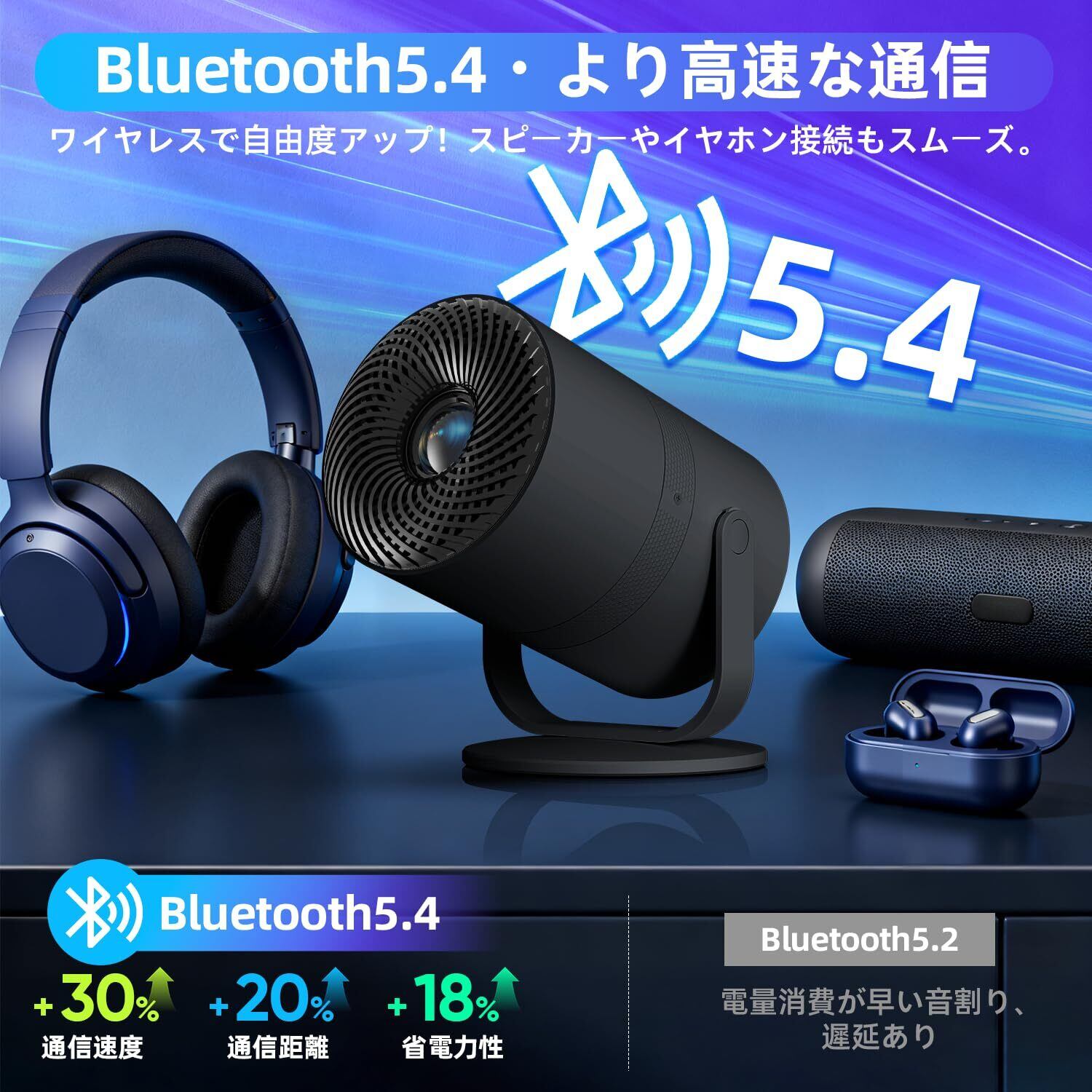 【Wi-Fi 6 & Bluetooth 5.4で高速接続・低遅延を実現】現代のマルチデバイス環境において、安定した接続性は不可欠です。このホームプロジェクターは最新のWi-Fi 6規格を採用。動画ストリーミングが従来より格段に高速で安定し、高画質な動画やゲームを楽しむ際の読み込み待ちや途切れ、遅延を大幅に軽減します。さらにBluetooth 5.4を搭載。ワイヤレスイヤホンや外部スピーカーとの接続がより低遅延で信頼性高く行え、深夜の視聴や大音量での再生時にも周囲を気にせず、没入感のあるサウンドを楽しめます。内蔵の高品質スピーカーでも十分な音響性能を発揮しますが、お好みのオーディオ機器と簡単に接続し、ホームシアター級のサウンド体験をカスタマイズできるのも特長です。スマートフォンやタブレット、PCとの画面ミラーリングもスムーズ。ビジネスプレゼンから家族での写真共有まで、多彩なシーンで活用できる、柔軟で高性能な接続性を備えています。