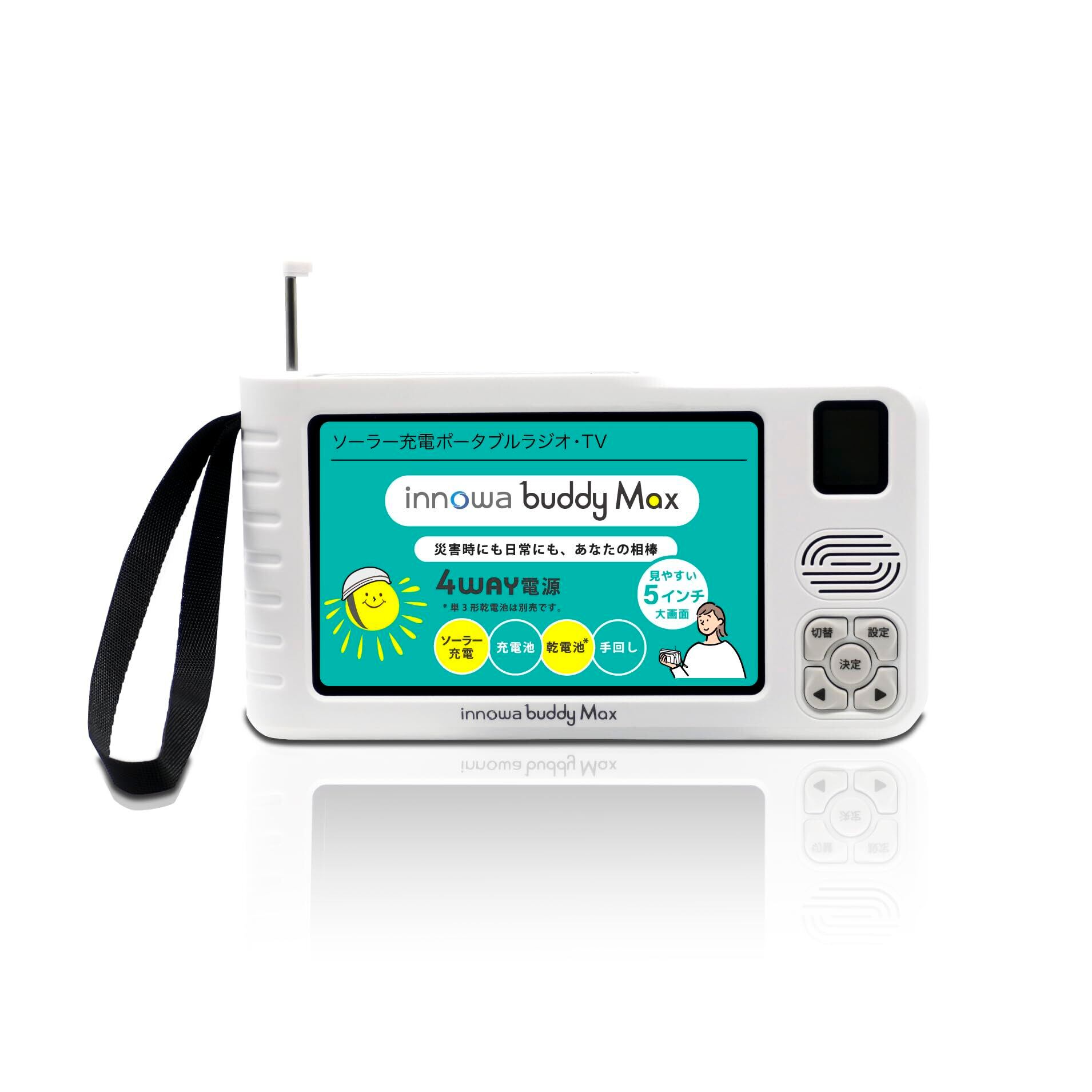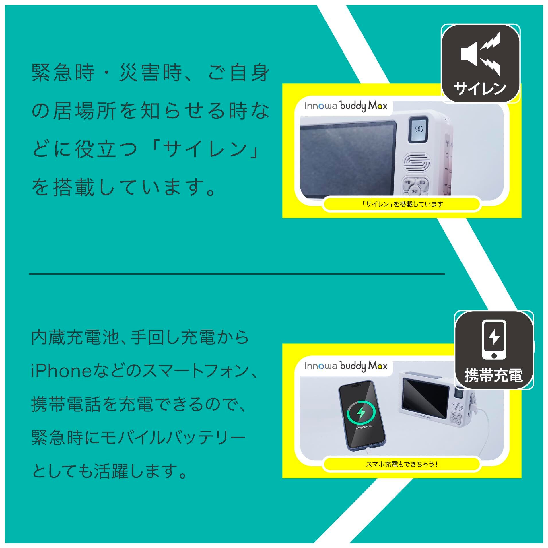 innowa(イノワ) buddy Max 手回し ソーラー充電 ポータブルテレビ・ラジオ AM/ワイドFM/短波 5インチ大画面 4WAY電源 LEDライト サイレン モバイルバッテリー 防災士