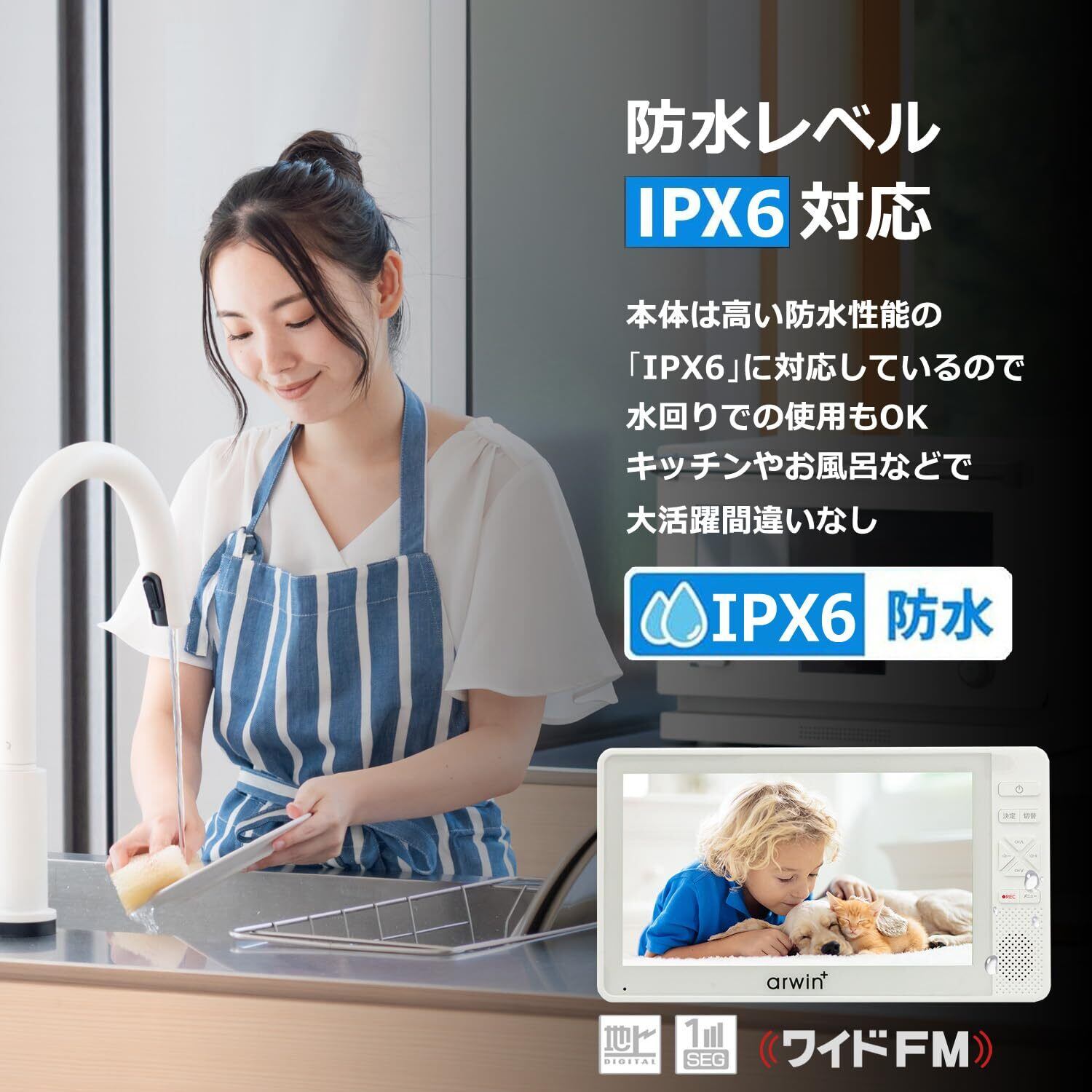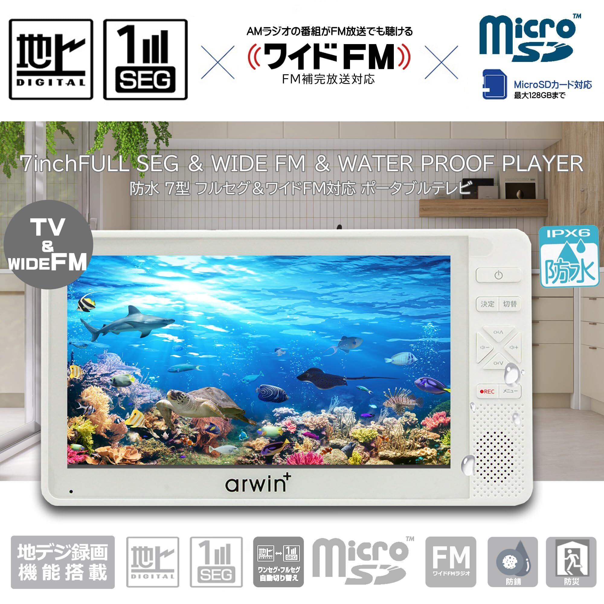 防水テレビ 7型 お風呂用 ポータブル ホワイト 携帯 FM/AMラジオ搭載 IPX6 ワンセグ ポケットTV 携帯 防災 超軽量 携帯可能 ホーム 防災グッズ 7インチ 防水フルセグ 19 型 液晶 g004
