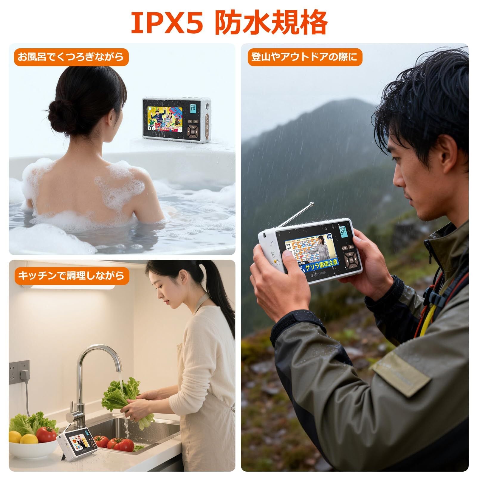 【JIS IPX5 準拠 防水強化|マルチシーンで大活躍】生活防災インテリジェンス設計を徹底実装!キッチン家事時の水しぶきに晒されても安心、工事現場休憩時の雨天屋外設置にも対応、登山時の突発降雨に備えた情報確認もスムーズ —— 家事・作業・アウトドアまでマルチシーンで大活躍。JIS 規格 IPX5 に準拠した防水性能を大幅強化、小雨や作業中の突発水しぶきはもちろん、雨天屋外視聴・水回りでの機器操作にも高い防護力を発揮。全天候型の使用シーンをさらに拡大し、いつ・どこでも情報を途切れさせずキープできる安心感を実現します。