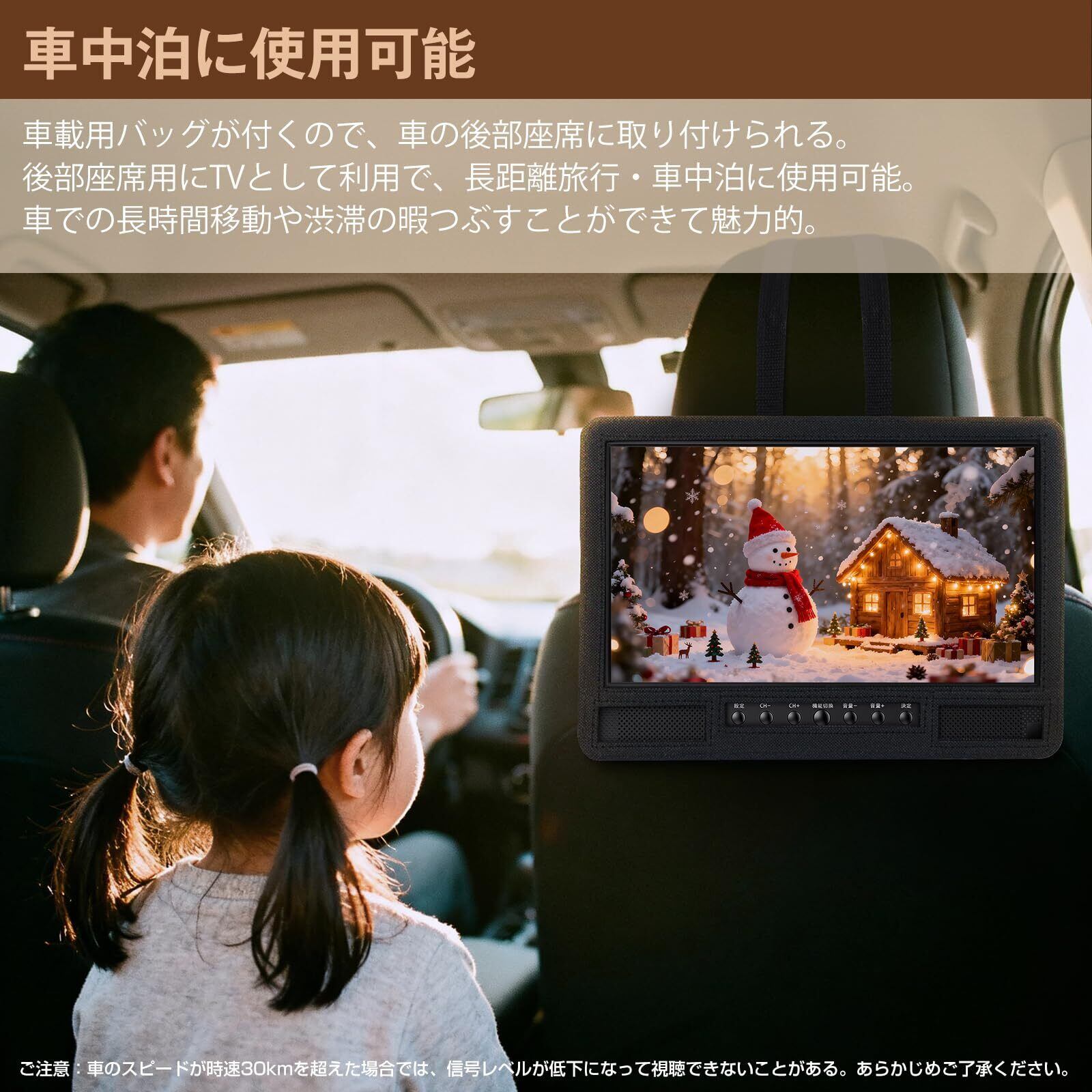 [車中泊に使用可能]車載用バッグが付くので、車の後部座席に取り付けられます。後部座席用にTVとして利用で、車中泊に使用可能です。