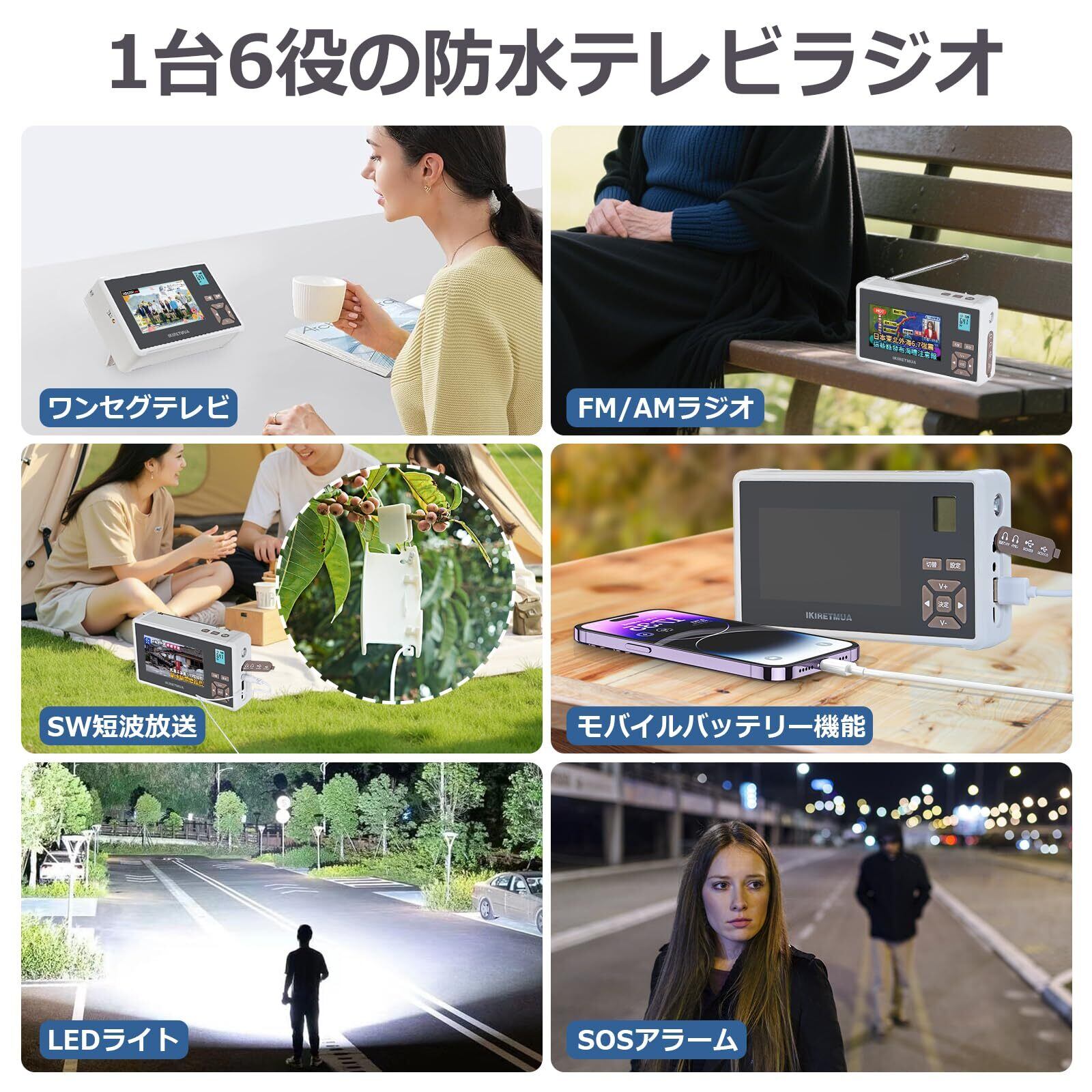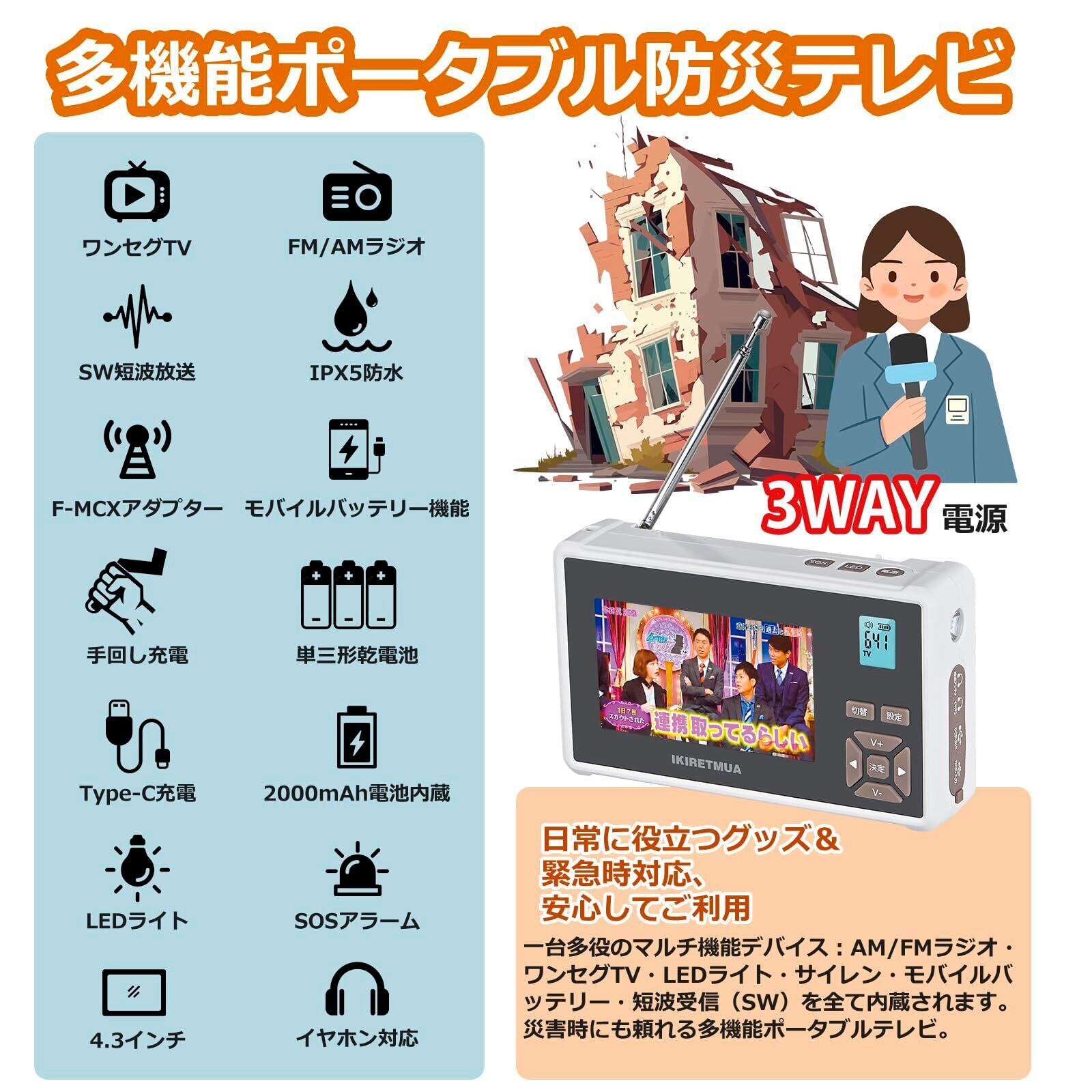 ポータブル テレビ IPX5防水4.3インチ ワンセグ TV 防災ラジオ 単三電池&手回し充電&USB給電 お風呂テレビ FM/AM多機能防災グッズ SOS機能 LEDライト付き アンテナ不要 防災用品対応 日常・台風・地震にも適用 日本語説明書