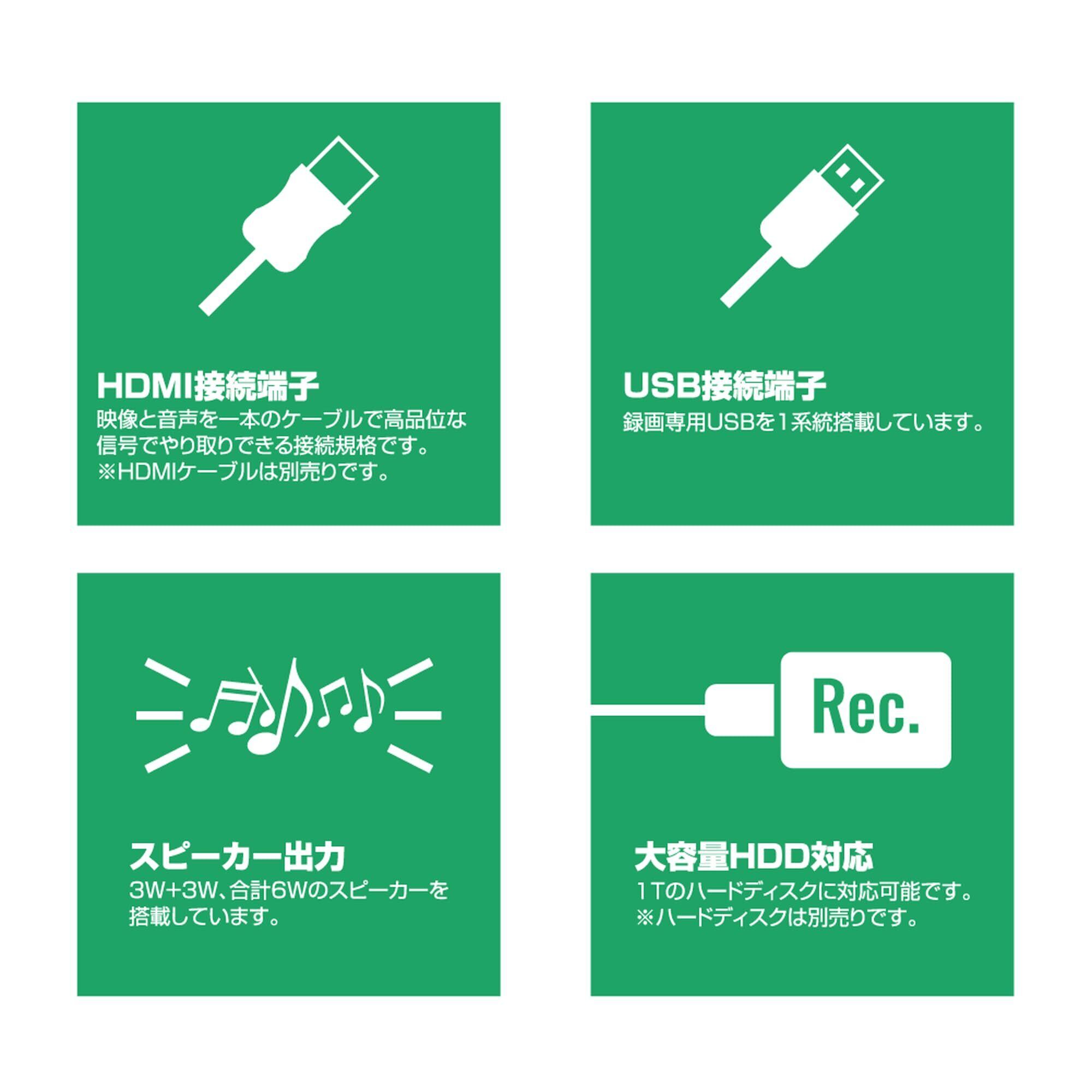 [入力端子] HDMI×1 / 録画用USB端子×1 / ビデオ端子×1 / デジタル音声端子×1 / φ3.5mmステレオヘッドホンジャック×1