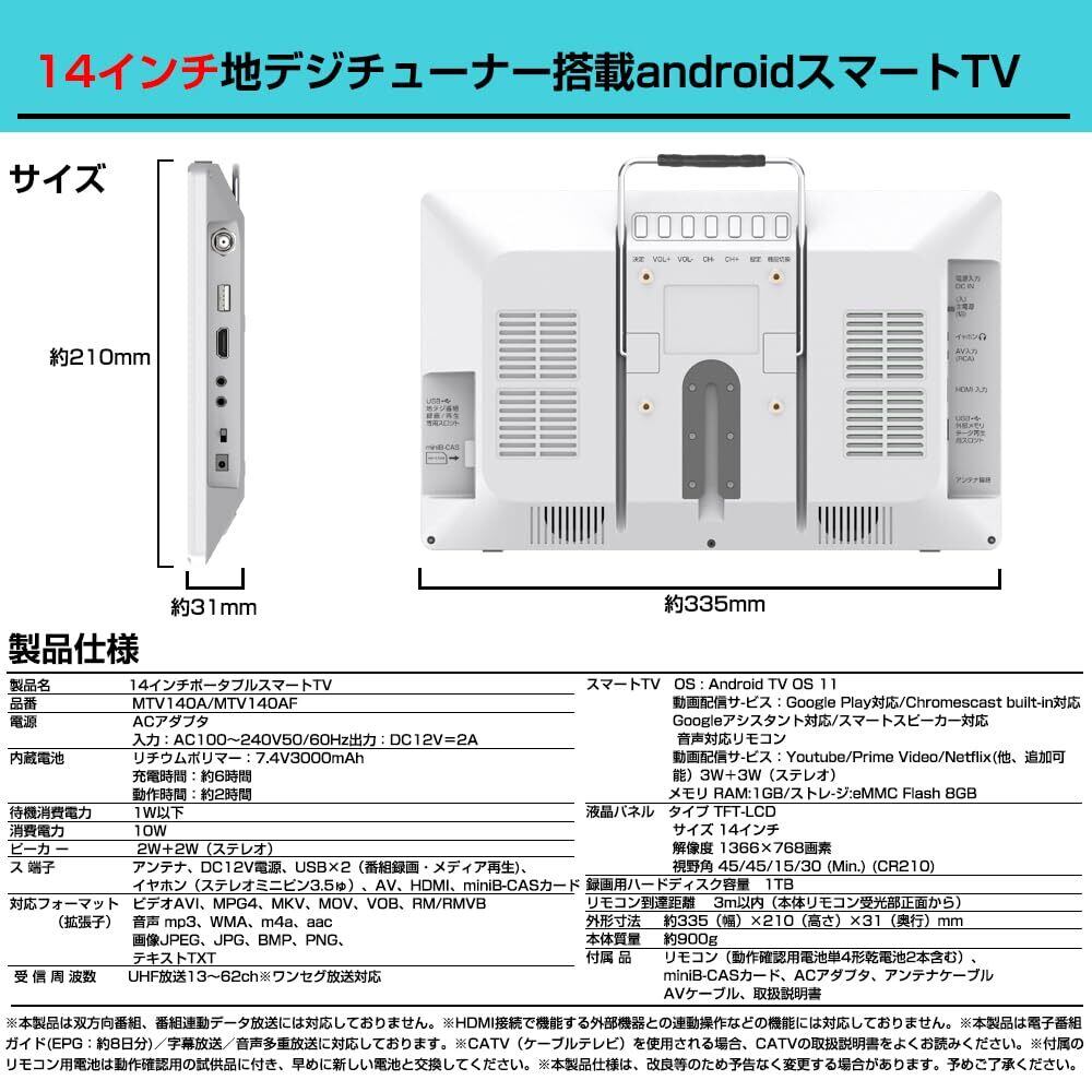 14V型ポータブルスマートテレビ(Android TV)+Fullseg地デジ内蔵/ネット動画対応/ハイビジョン液晶テレビ/SmartTV(YouTube/primevideo/NETFLIX/GooglePlay)/HDMI/WiFi 2.4GHz/5.0GHz/Bluetooth+IRリモコン(Hey Google機能) (スタンド置き・壁掛け)VESA準拠75×75mm