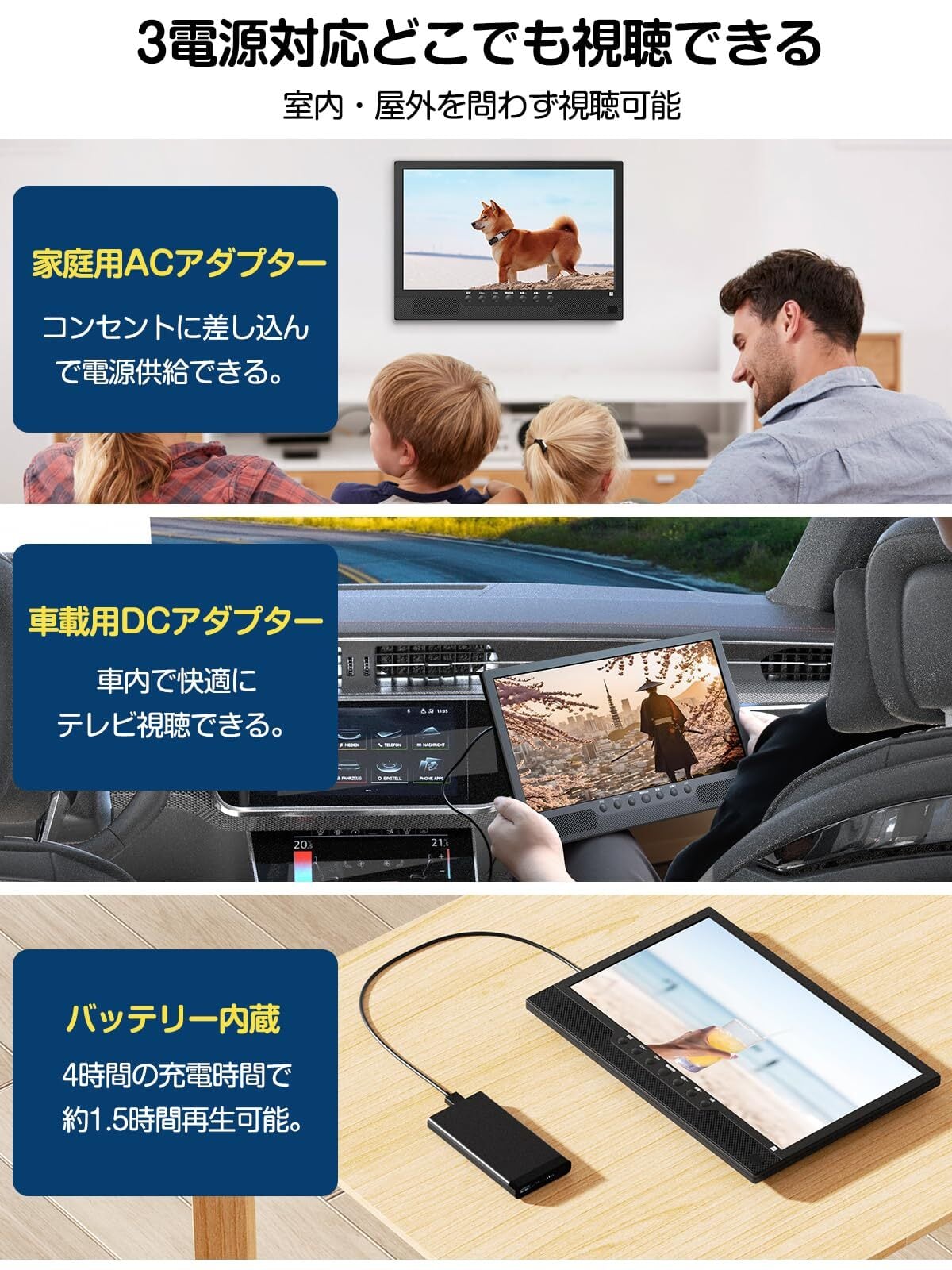 【3WAY電源対応】電源もAC(家庭用)、DC(車載用)、バッテリー(2000mAh)3タイプに対応しているので家でも外でも使えます。ベッドルームや書斎など、さまざまな場所へ持ち運びやすい14.1インチのポータブルテレビです。AC電源・USB電源は、キッチンや子ども部屋など屋内での使用に適しています。カーアダプター対応できるので、車での視聴も快適に楽しめる自動車用テレビ。