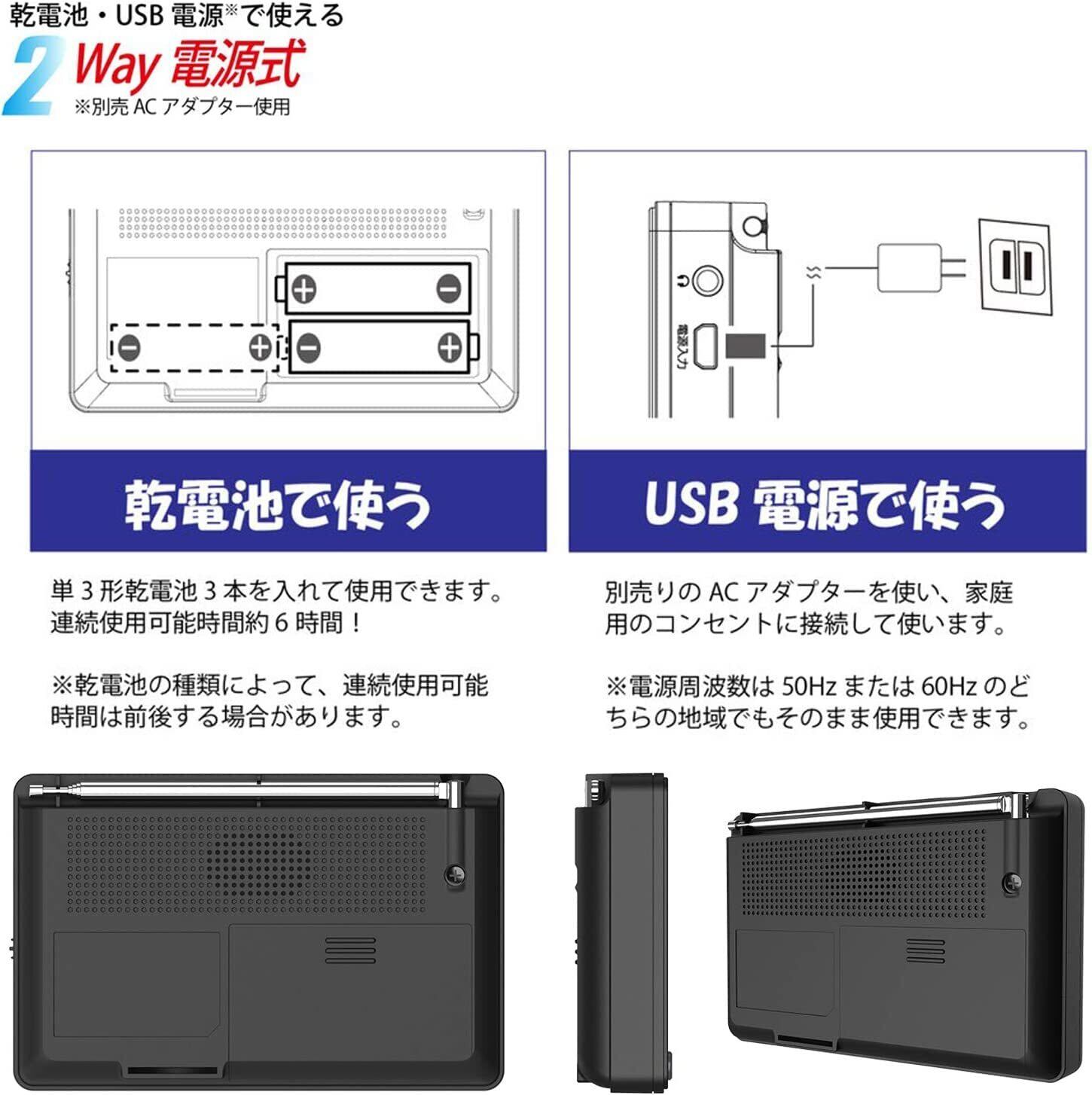 [電源] 単3乾電池×3本(TV連続使用可能時間約6H)/ DC5V(USB)※別売ACアダプター利用