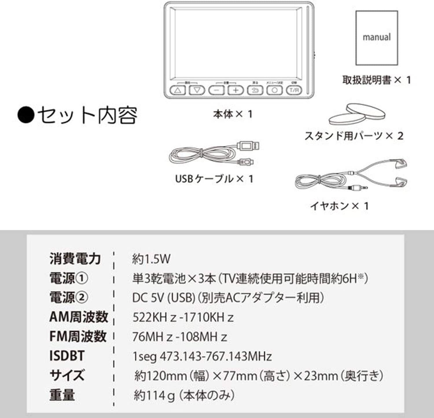 [機能] ワンセグ視聴 / AM/FMラジオ対応 / 手のひらサイズ / 2way電源式(乾電池・USB電源) / スタンド付き /外部アンテナ対応(F型)