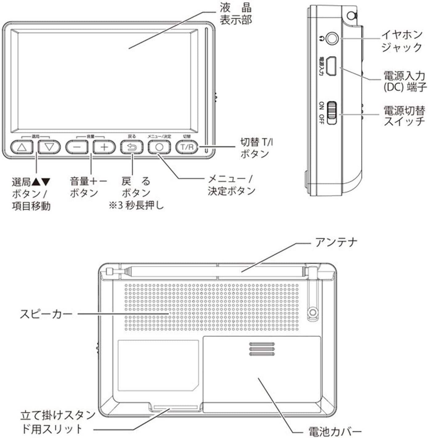 特徴 ■2way電源式(乾電池・USB電源), ■AM/FMラジオ対応, ■スタンド付き, ■ワンセグ視聴, ■外部アンテナ対応(F型)