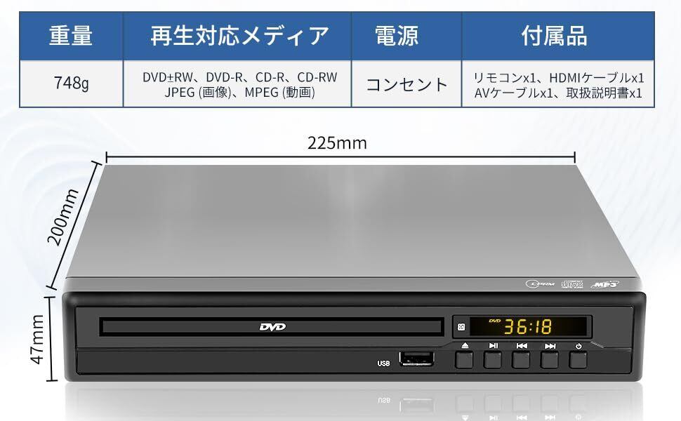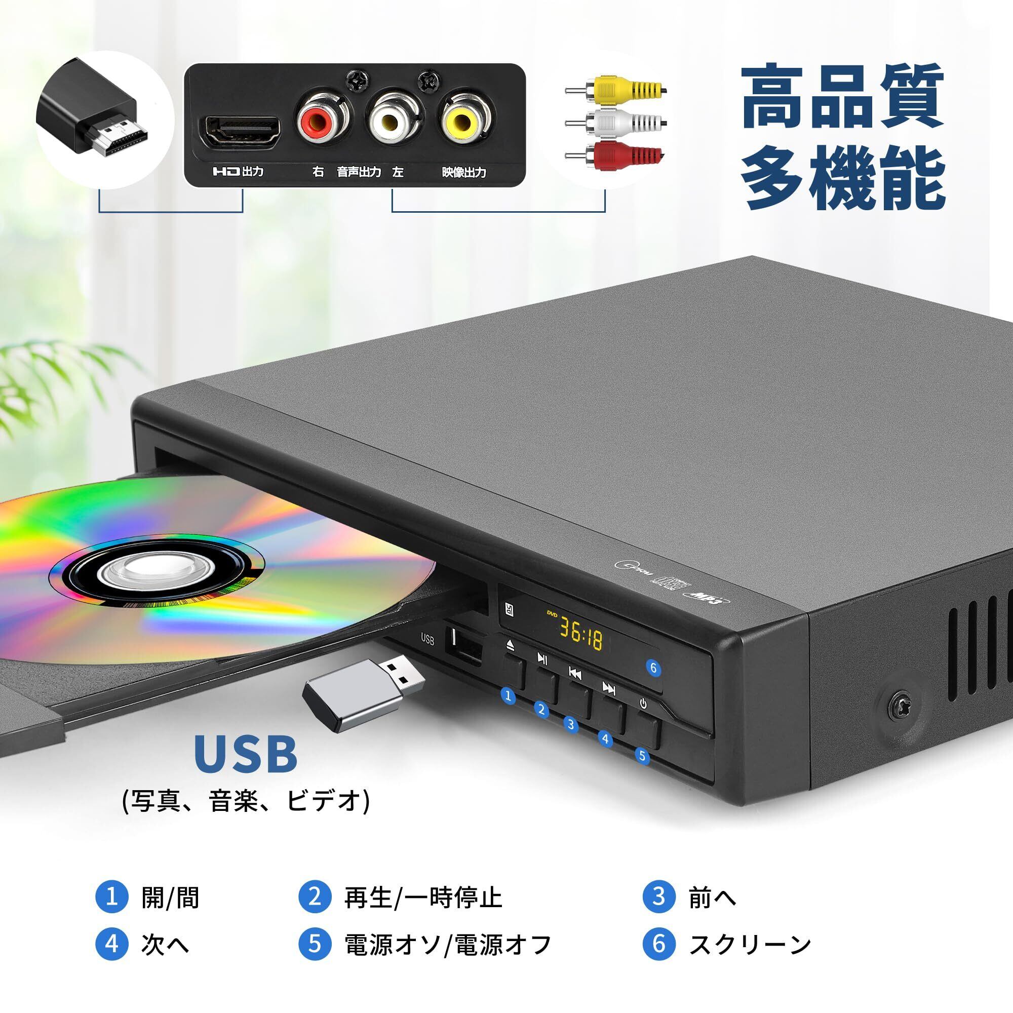 DVDプレーヤー テレビ用 1080P HDMI/AV出力 リージョンフリー CPRM高対応 地デジ録画快適再生 断電記憶再生 多種ディスク形式対応(DVD±R/RW・CD/CD-R/-RW/-G・VCD) 多様なファイル形式再生(MPEG1/2(動画)、MP3/WMA(音楽)、JPG/JPEG(画像)) プロジェクター接続可 リモコン付き(電池なし) 日本語取扱説明書付き ブルーレイ非対応