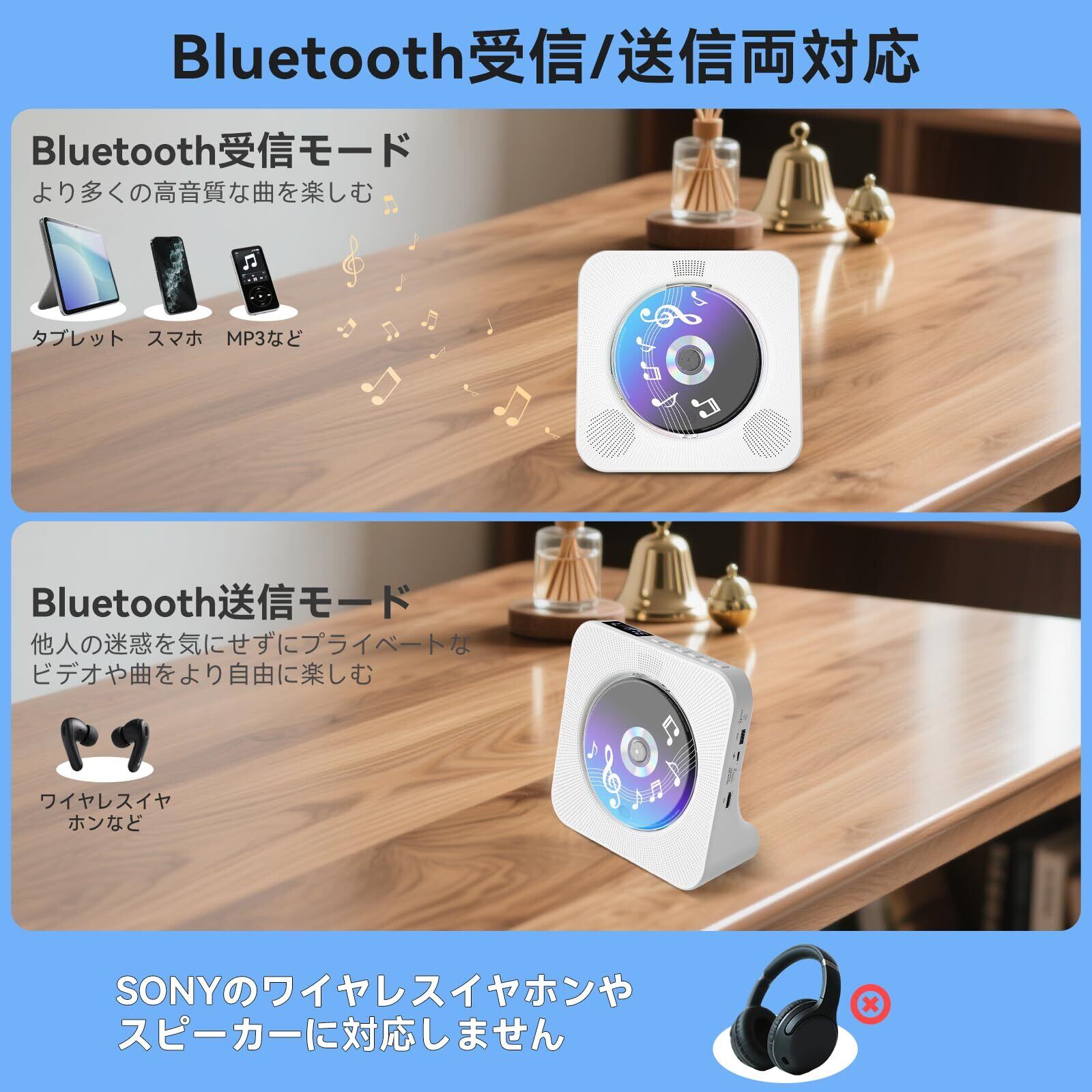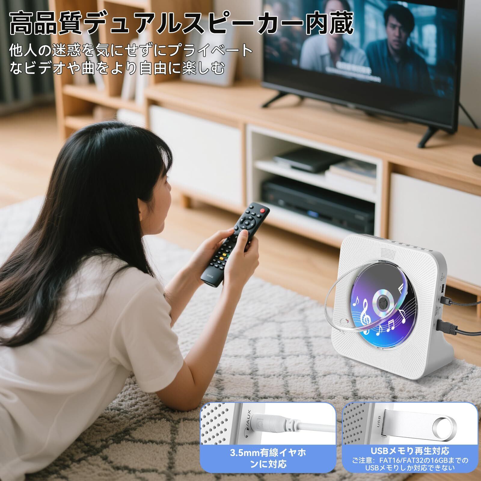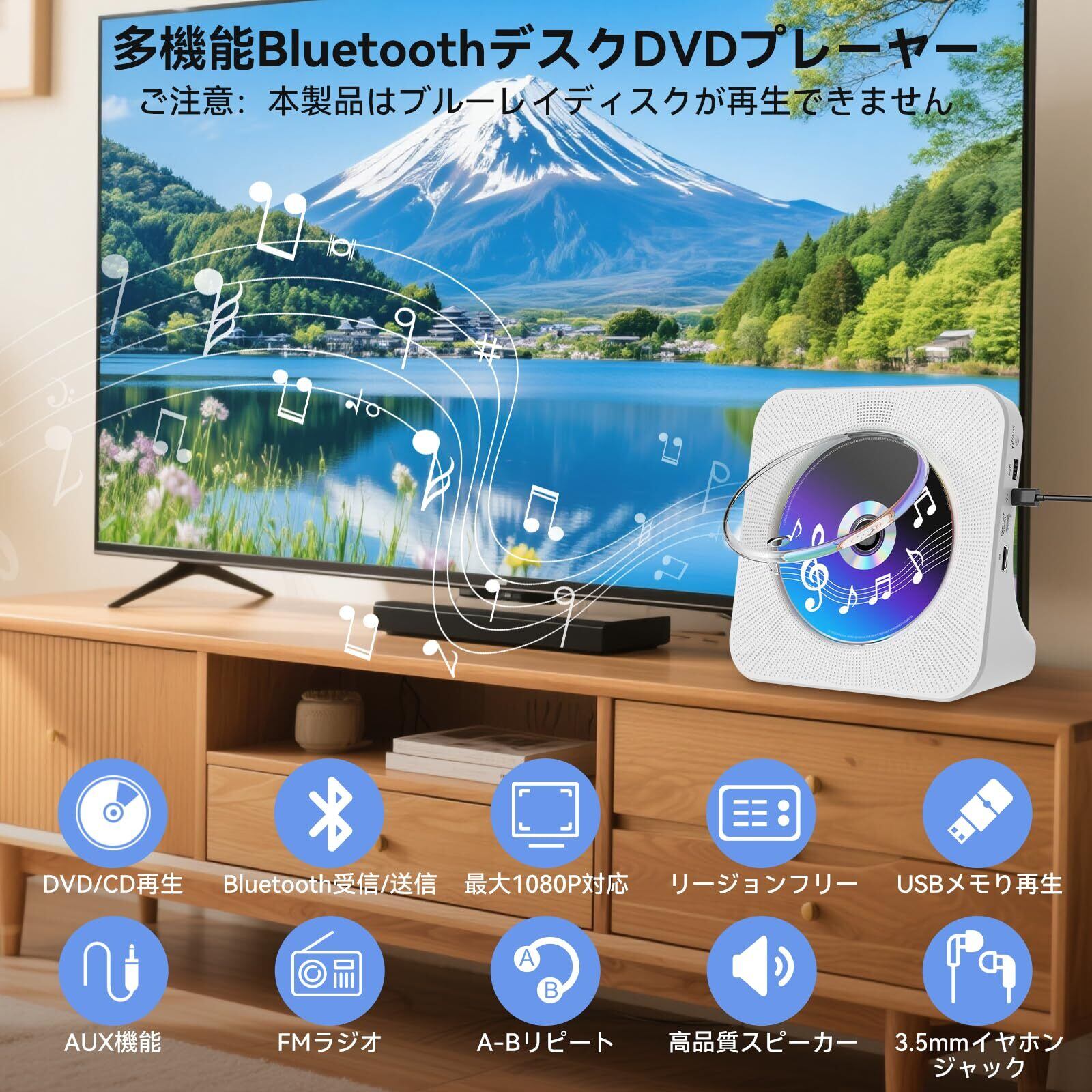 【一台多役!!Bluetooth送受信対応DVD/CDプレーヤー】この一台でDVD/CD再生はもちろん、Bluetoothスピーカーとしても、スマートフォンから音楽をワイヤレス再生!さらに、Bluetooth送信機能で、お手持ちのワイヤレスイヤホン対応!FMラジオ(76-108MHz日本仕様)、USBメモリ(MP3/WMA)、AUX入力にも対応し、様々な音源を楽しめる多機能DVD/CDプレーヤーです。ご注意:1、最大32GBのUSBメモりに対応します。FAT16/FAT32のUSBフラッシュしか対応できません。NTFSのUSBフラッシュに対応しません。2、s-onyのワイヤレスイヤホンやスピーカーとairpodsに対応しません。