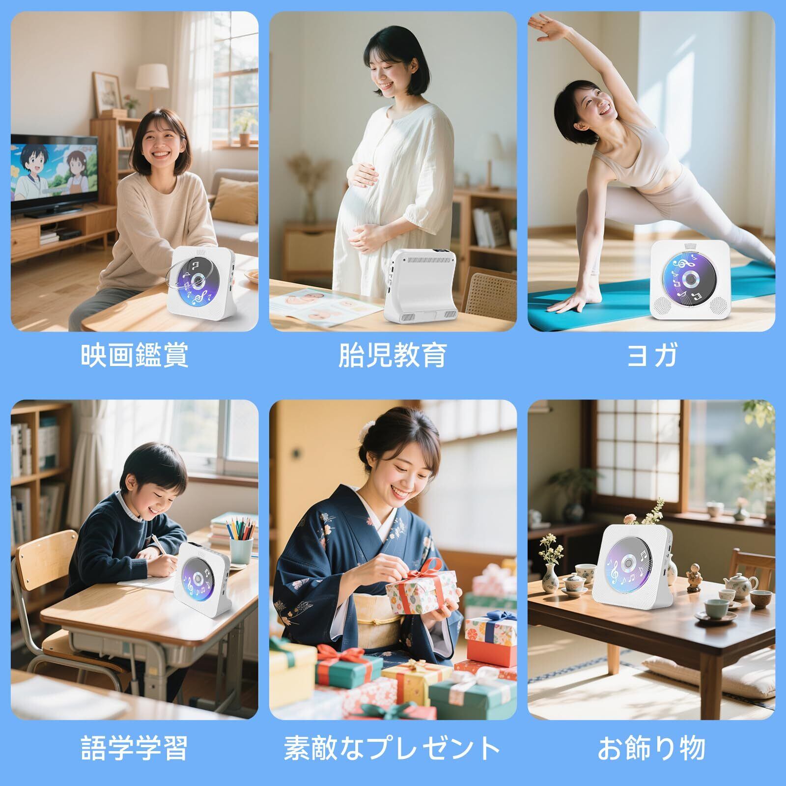 【多彩なファイル形式に対応&様々な場所に適用】本製品はDVD/VCD/CD/CD-G/HD-CD/WMA/AVI/MP3/JPEGなど様々なディスクとファイルに対応した幅広く使えるディスクDVD/CDプレーヤーで、家、部屋、喫茶店、教室、レストラン、パーティー、集まり、飲み会など多くなシーンにも適用されます。高級感が溢れるオシャレで人目を引くデザインはインテリアとしても最適です。さらに、幼児教育と胎児教育、出産前教育、誕生祝い、結婚祝い、新築祝い、開店祝いなどの素敵な贈り物として最適です。ご注意:ブルーレイディスクが再生できません、ご了承ください