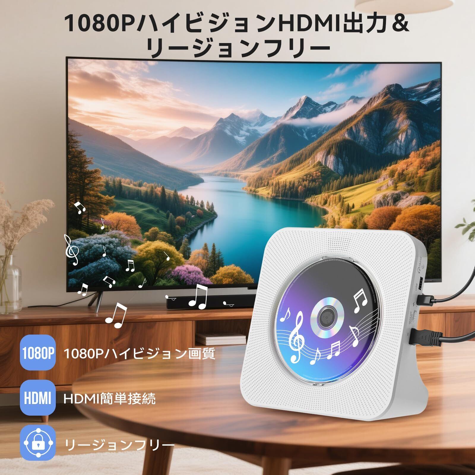 DVDプレーヤー bluetooth送受信 HDMI出力対応 最大1080P対応 リージョンフリー CD対応 CDプレーヤー スピーカー内蔵 USB再生/AUX入力 車用対応 高齢者向け DVDプレイヤー リモコン付き 操作簡単 cdラジカセ ワイドFMラジオ リピート/A-Bリピート イヤホン対応 映画鑑賞 音楽再生 語学学習 PSE認証済み 取扱説明書付き 充電不可 ホワイト