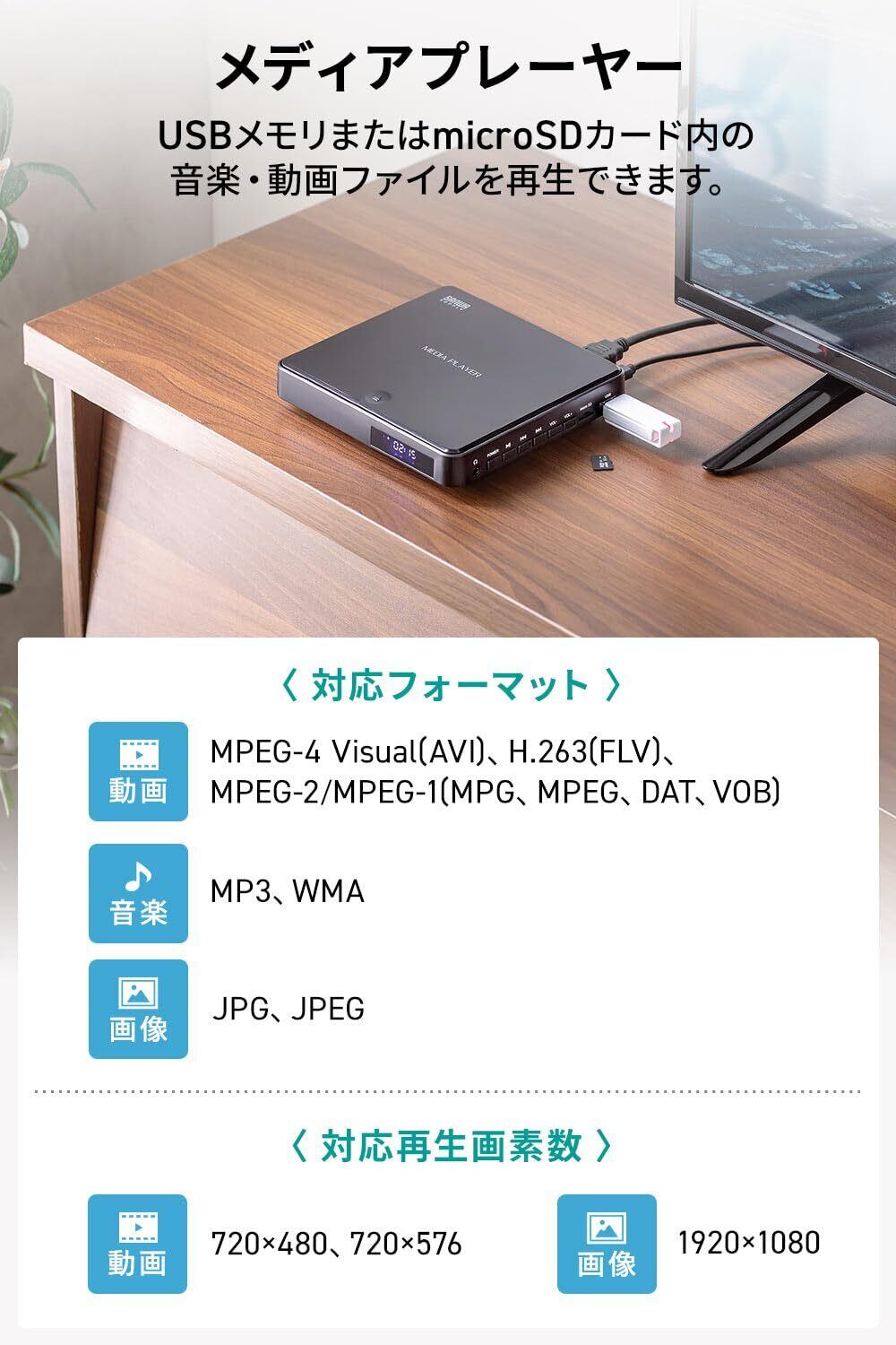 CDの音声をmp3形式の音楽ファイルとして microSDカード 、 USBメモリ に録音することができます。USBメモリ、microSDカード内の動画・音楽ファイルを再生するメディアプレーヤー機能も搭載しています。