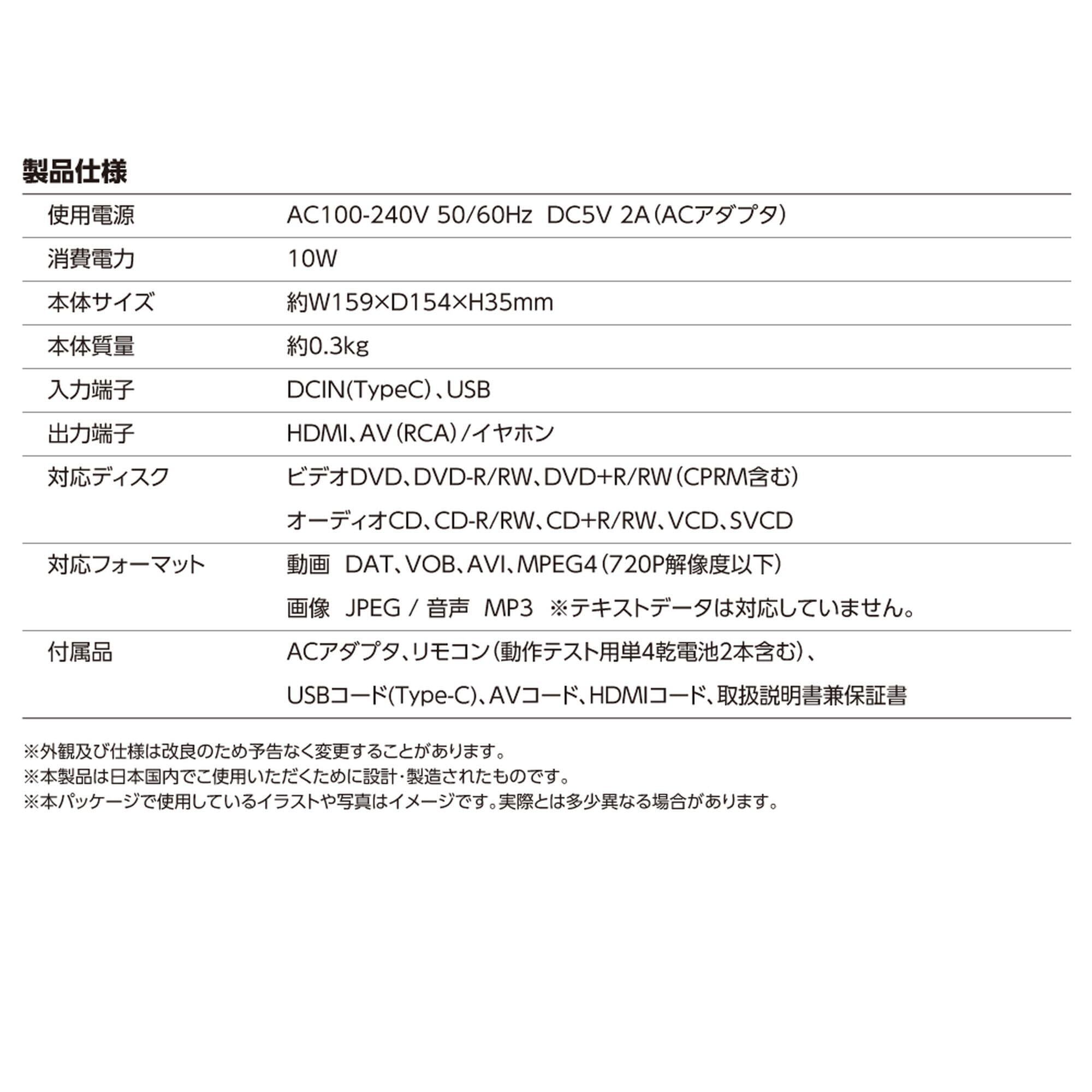 [対応ディスク]ビデオDVD、DVD-R/RW、DVD+R/RW(CPRM含む)、オーディオCD、CD-R/RW、CD+R/RW、VCD、SVCD