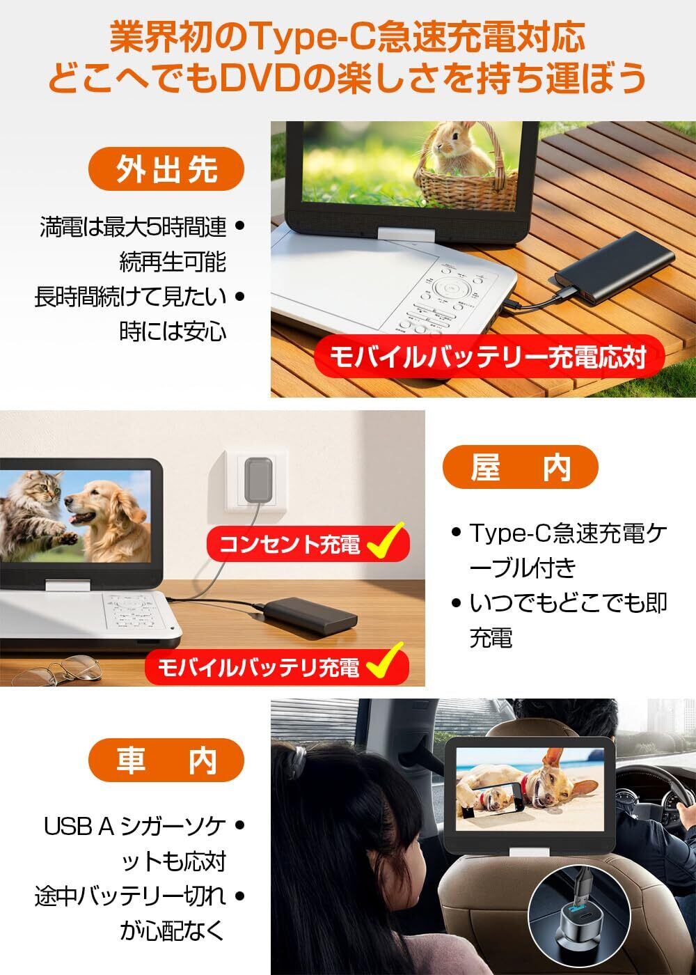 子どもを連れてのドライブは楽しい旅先での移動中や、ちょっとした空き時間に映画やドラマを楽しみたいと思ったことはありませんか? そんな時にポータブルDVDプレーヤーがあれば、お気に入りのアニメや映画で旅の退屈を解消!大人も子供も、移動時間を快適に過ごせる。業界初のType-C急速充電対応、家庭用のDC・車載用のDC・モバイルバッテリーから充電・バッテリー内蔵と4WAY電源に対応します。1.5M Type-Cケーブルと5V 2Aアダプター付き、お宅、車中、アウトドア様々なシーンで用途に応じて使いやすい。大容量バッテリー内蔵で、CD最大5時間・DVD最大4時間再生が可能、長時間続けて見たいときにも安心です