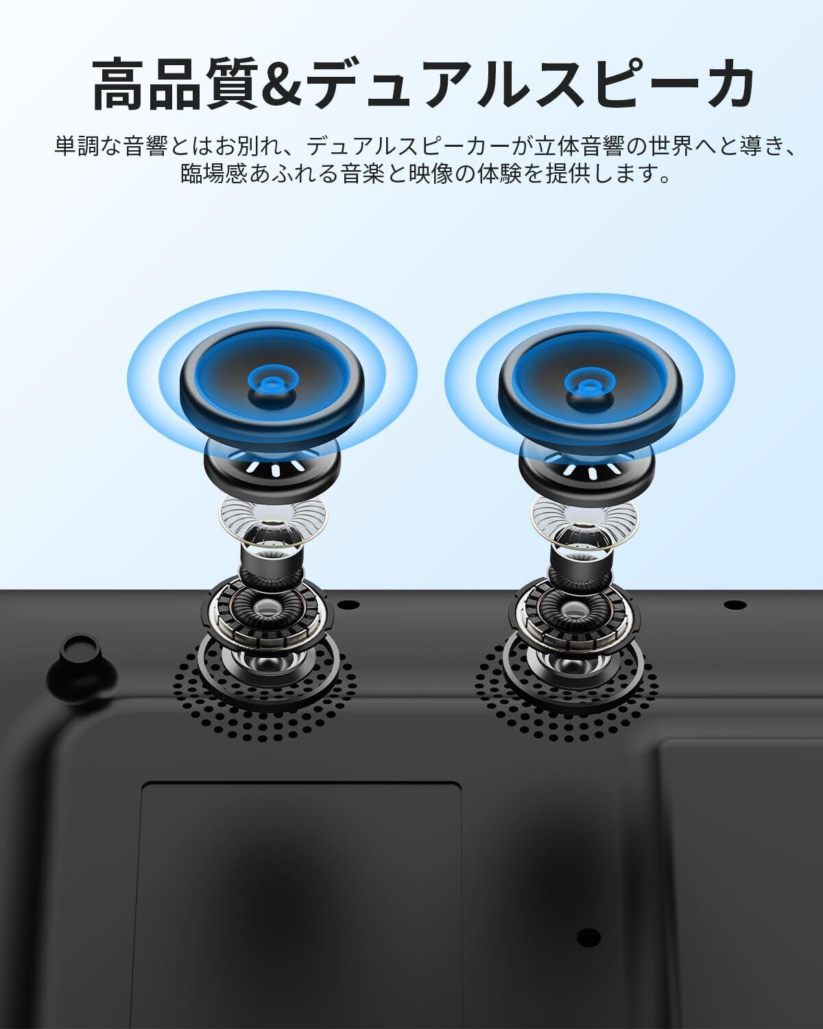 【高画質・多角度・省空間・臨場感】このDVDプレーヤーは、10.5インチの高解像度ディスプレイを搭載。1024*600の液晶パネルを採用し、クリアで繊細な映像を映し出し、高画質の映像世界を存分にお楽しみいただけます。270°回転・折りたたみ可能なデザインで、視聴角度を自由に調整でき、座っていても、寝転んでいても、最適な視聴ポジションを見つけられます。例えば、折りたたみ式DVDプレーヤーは、特に車の後部座席での使用に最適で、限られたスペースでも最大限に活用でき、旅行やアウトドアでのエンターテイメントに最適です。さらに、内蔵デュアルスピーカーにより、豊かで立体的なサウンドを実現し、没入感のあるオーディオビジュアル体験をもたらします。