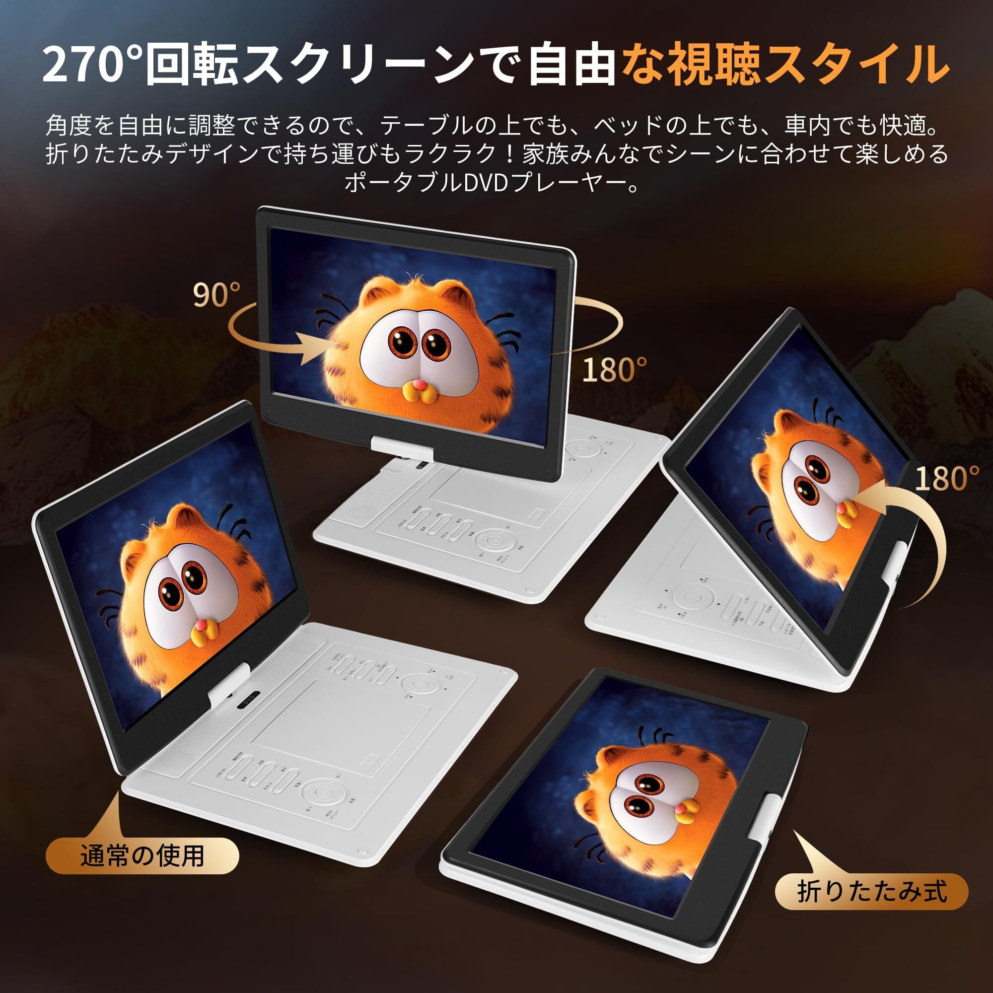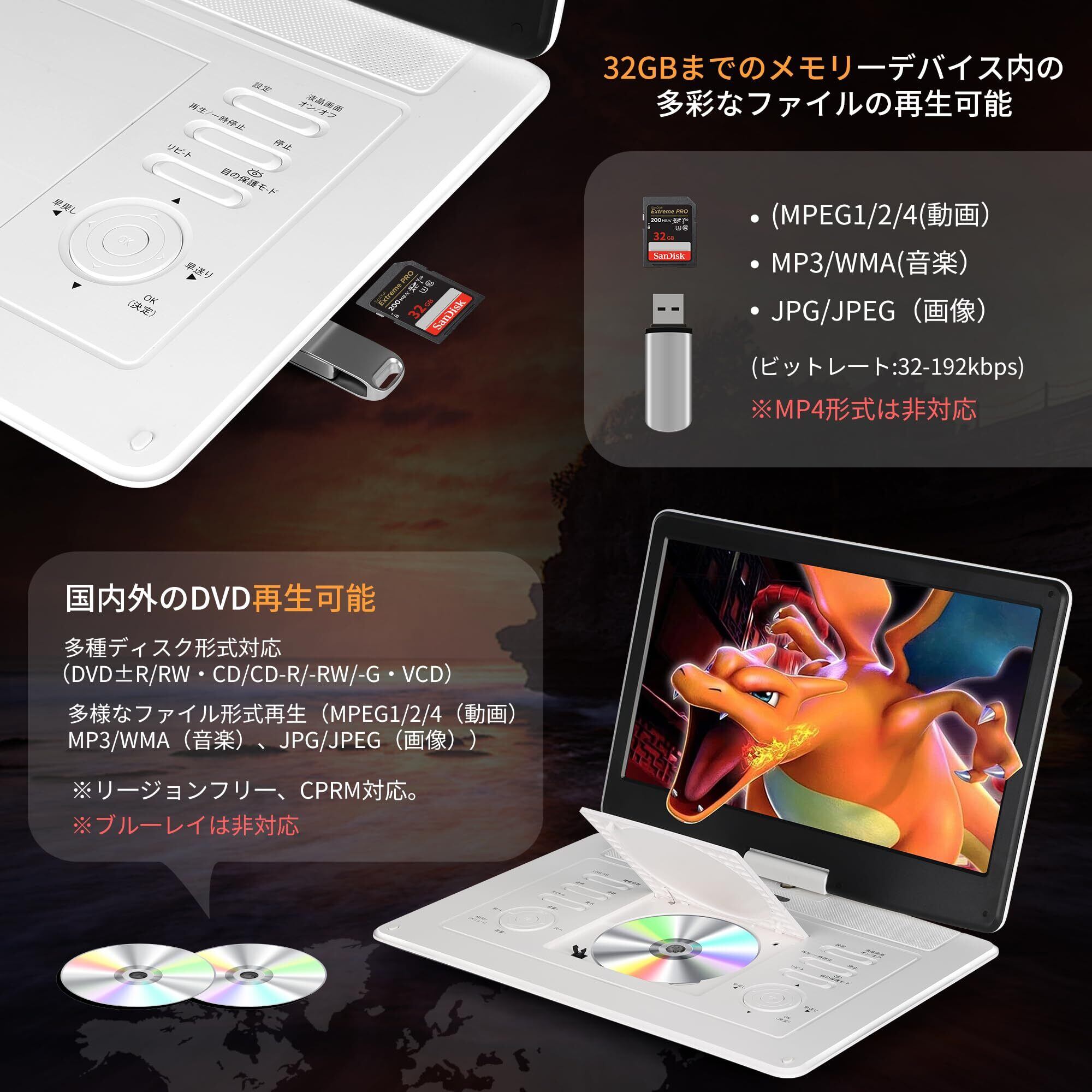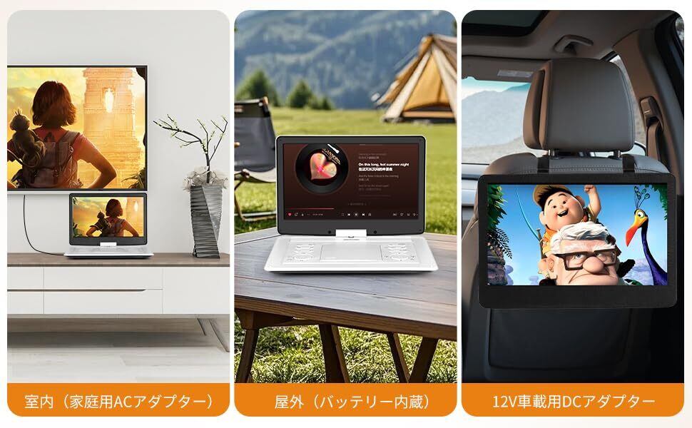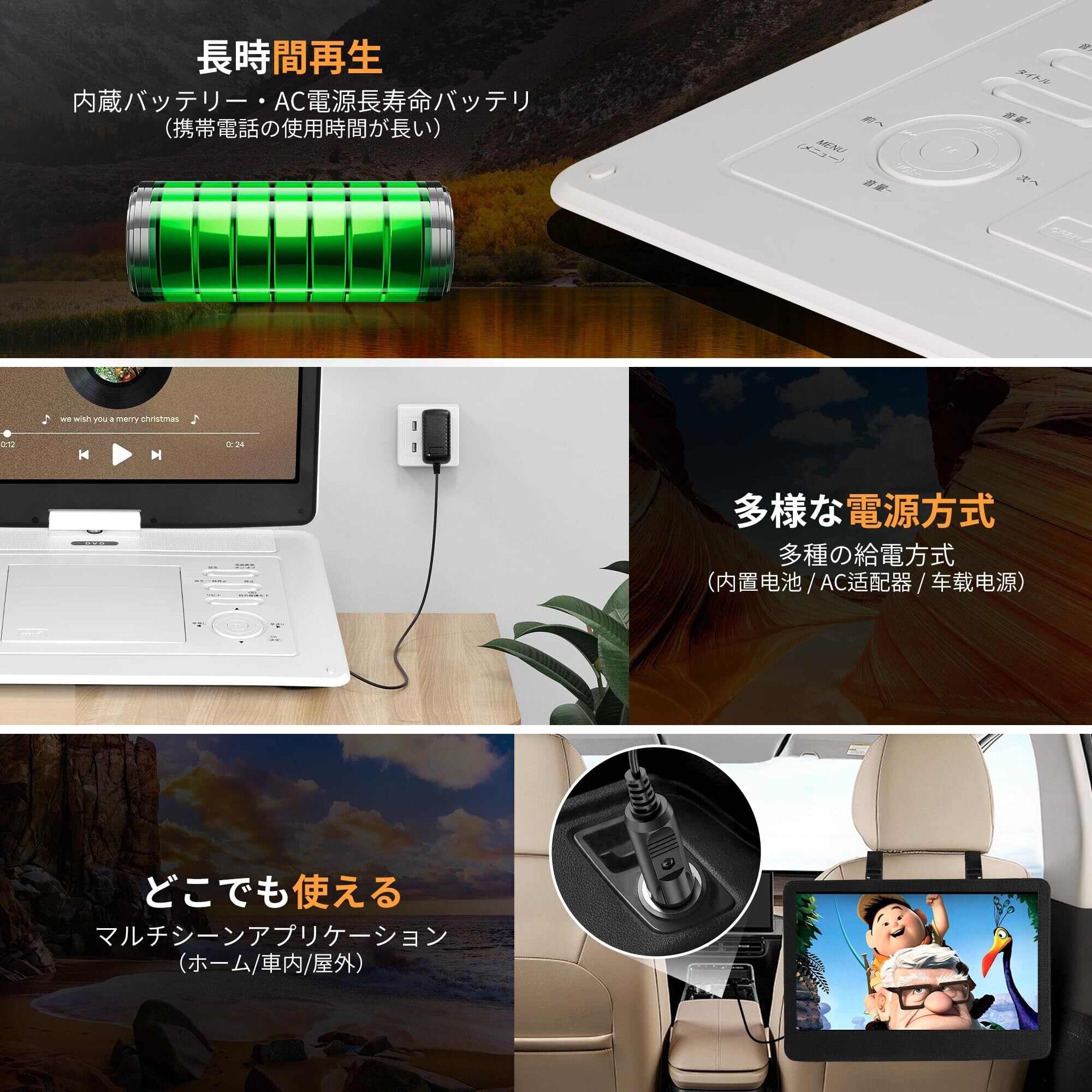 長時間再生&3種類の充電方式 内蔵の 4000mAh充電式リチウム電池 により、 最大 約4.5時間の連続再生 が可能。外出先や車内でも途切れることなく映像や音楽を楽しめます。 バッテリーには、 過充電保護 過放電保護 過熱保護 といった安全機能を搭載しており、長時間でも安心して使用できます。 充電方式は 3種類 に対応: 認証済み ACアダプター 車載用シガーソケットアダプター USB給電(モバイルバッテリー対応) 家庭・車内・旅行先など、さまざまなシーンで柔軟に充電可能です。 映画鑑賞、学習教材視聴、音楽再生、写真スライドショーなど、長時間のエンターテインメントに最適。 ※再生時に異音やノイズが出る場合は、ディスクをアルコールで軽く清掃してからご使用ください。
