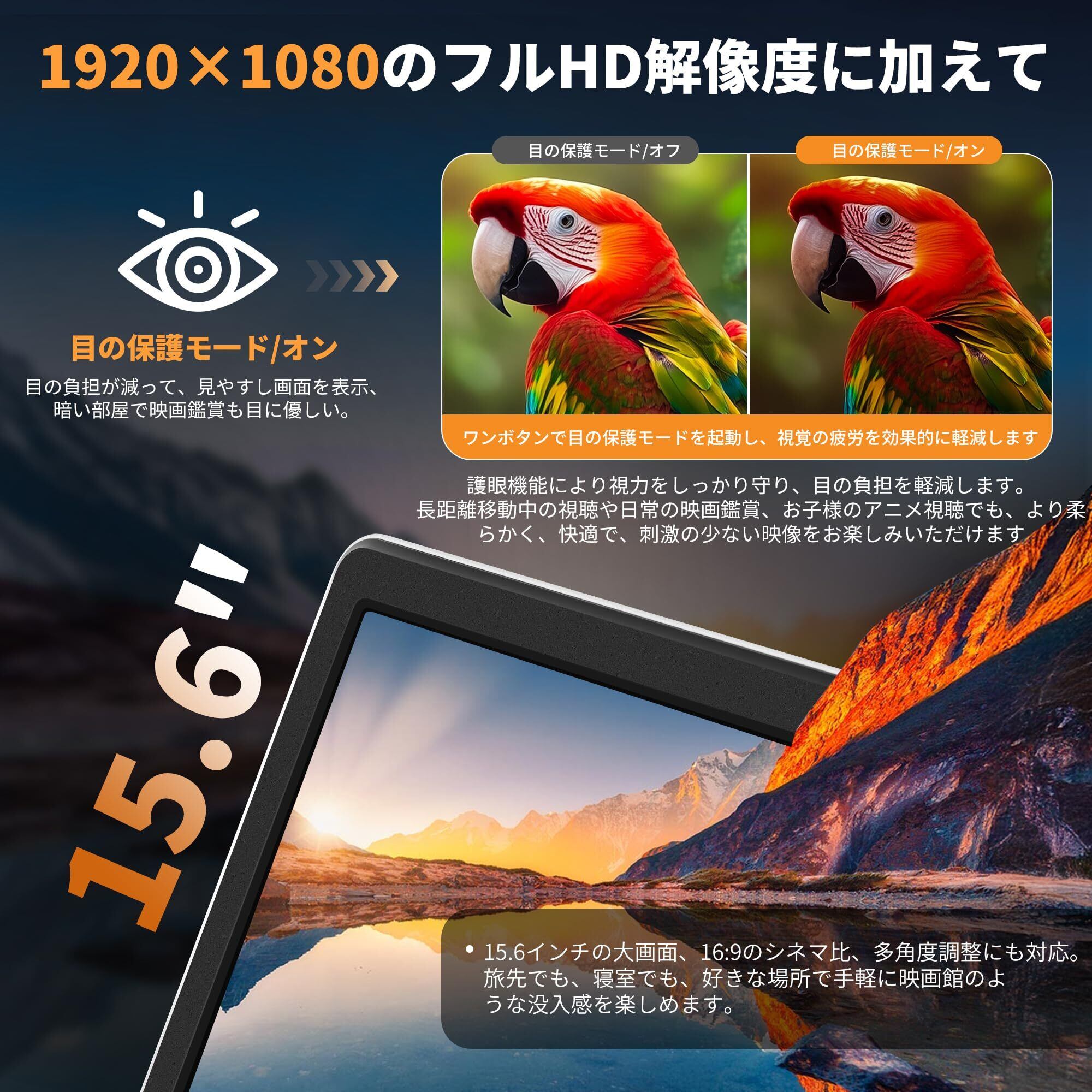 大画面・フルHD液晶・目にやさしい設計 15.6インチの大画面に、1920×1080フルHD液晶を搭載。文字や字幕、細かな映像表現まで、驚くほどクリアに映し出します。 画面は 左右±90°/上下±30°のマルチアングル視聴 に対応しており、ソファ・ベッド・車内など、どの角度からでも鮮明な映像を楽しめます。 さらに、ボタンひとつで切り替えられる 目にやさしいモード を搭載。長時間視聴でも目への負担を軽減し、お子様やご高齢の方にも安心してお使いいただけます。 16:9のワイドスクリーンは映画鑑賞にぴったり。学習教材、アニメ、YouTube形式の動画など、さまざまな映像コンテンツをより快適に視聴できます。