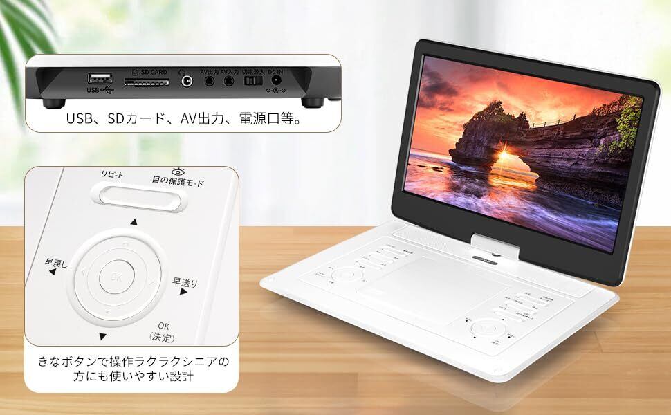 簡単操作&日本語対応 大サイズ・大ボタン専用リモコン搭載 特長 直感的な操作 大きなボタンとシンプルな設計で、誰でも簡単に操作可能。 お子様や高齢者でも安心して使えます。 リモコン仕様 最大操作距離:5m 上下角度調整:30° 日本語対応で操作が分かりやすい 日本語取扱説明書付き 各機能や操作方法を詳しく解説。初めての方でも安心。 イヤホン対応 3.5mmジャック搭載 周囲を気にせず個人で静かに視聴可能 携帯性に優れた多用途対応 家庭、車内、旅行先で簡単に使用可能 給電方法:ACアダプター、車載用DCアダプター、USB給電 付属品: 大サイズ・大ボタンリモコン ACアダプター(認証済み高品質) 12V車載用DCアダプター AVケーブル(RCA) 車載用収納バッグ 日本語取扱説明書 イヤホン対応(3.5mmジャック) すぐに使える 開封後すぐに使用可能。家庭、車内、旅行先など、あらゆるシーンで活躍します。