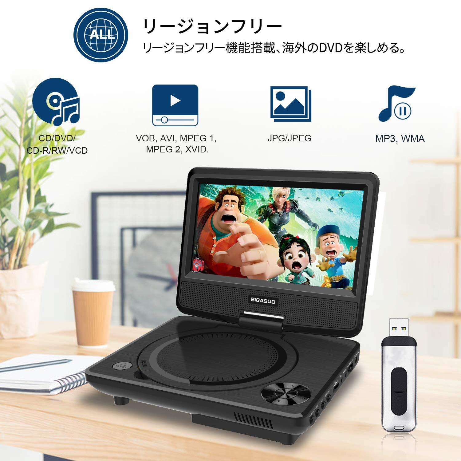 BIGASUO ポータブルDVDプレーヤー 7.5インチ 単3形乾電池式 6時間再生可能 リージョンフリー 車載 270度回転 AC DC 3電源対応 CPRM/USB/AVに対応 黒