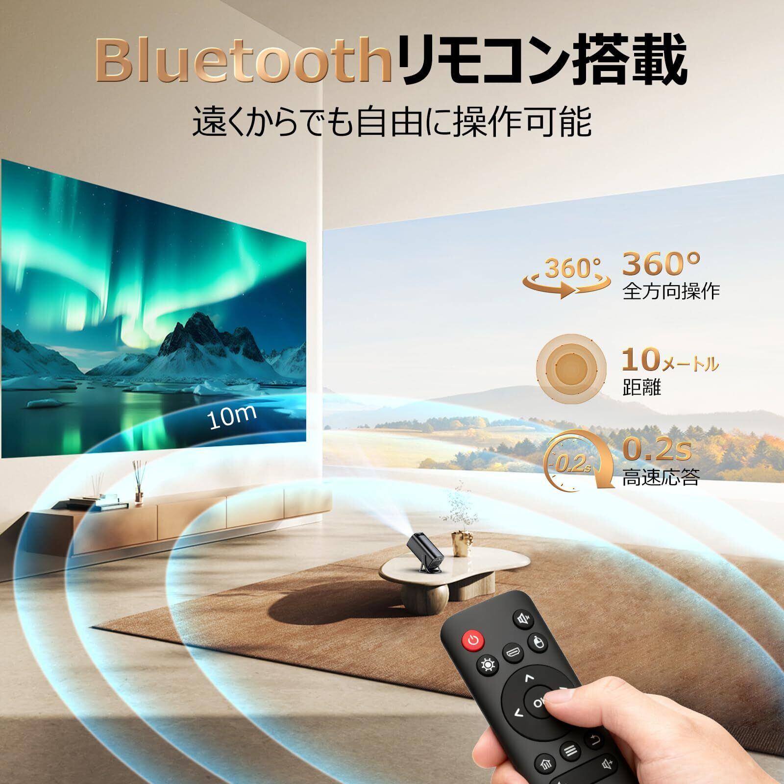 【Bluetoothリモコン・360°全方位調整&初心者向け】こんな悩みを抱えたことはありませんか?赤外線リモコンはプロジェクターの受信窓に正確に位置合わせする必要があり、近距離からしか操作できません。そうでないとリモコンが反応しません。また、赤外線リモコンは壊れやすいという問題もありました。このBluetoothリモコン付きプロジェクターはこれらの問題を解決します。距離や角度に制限がなく、10メートル以内のあらゆる角度からプロジェクターを操作でき、よりスムーズな視聴体験を提供します。そして、世界中の方々に優しいプロジェクターは、日本語、英語、中国語、スペイン語を含む82言語に対応しており、ニーズに合わせてお選びいただきます。また、詳しい日本語の取扱説明書も付属しておりますので、初心者の方でも安心してお使いいただけます。