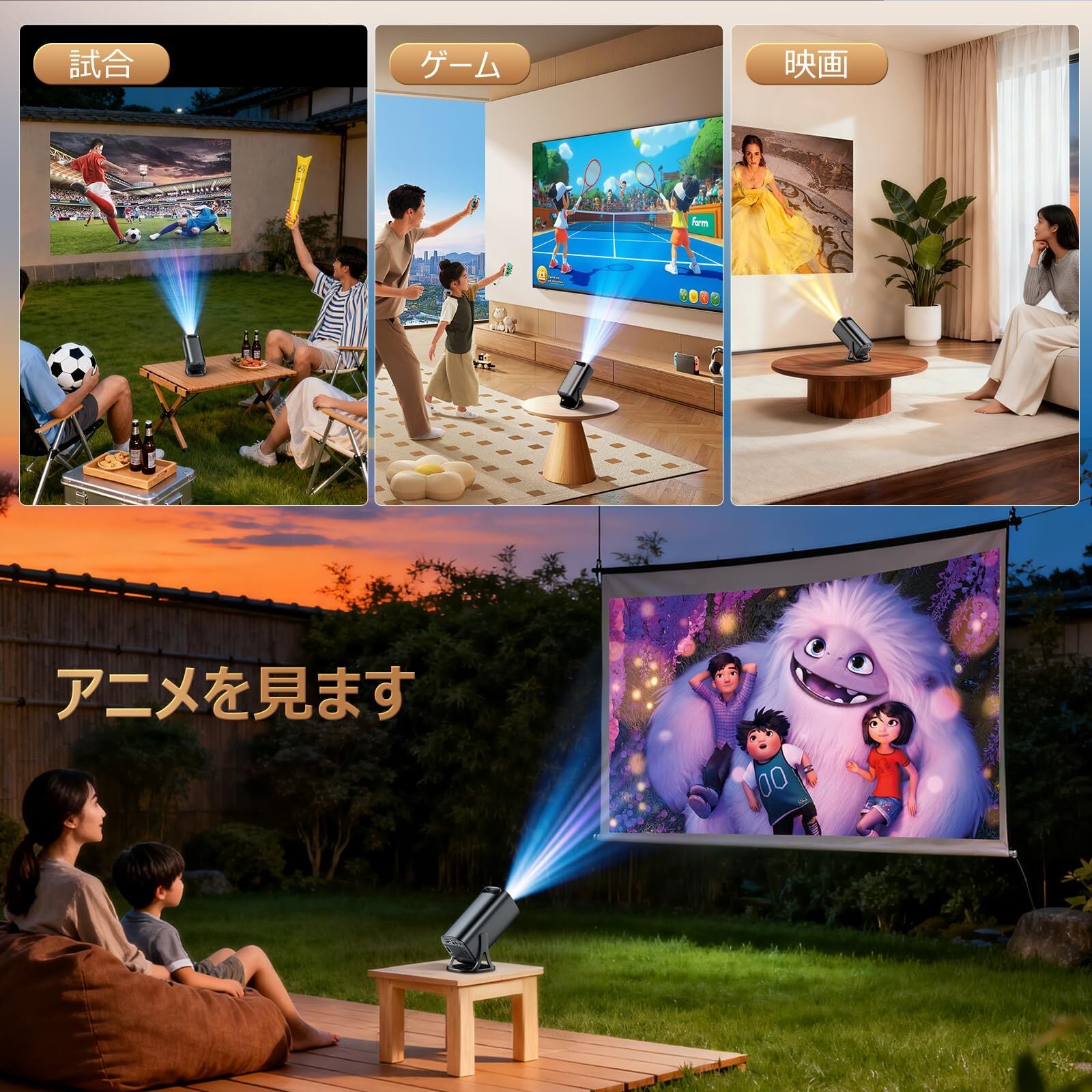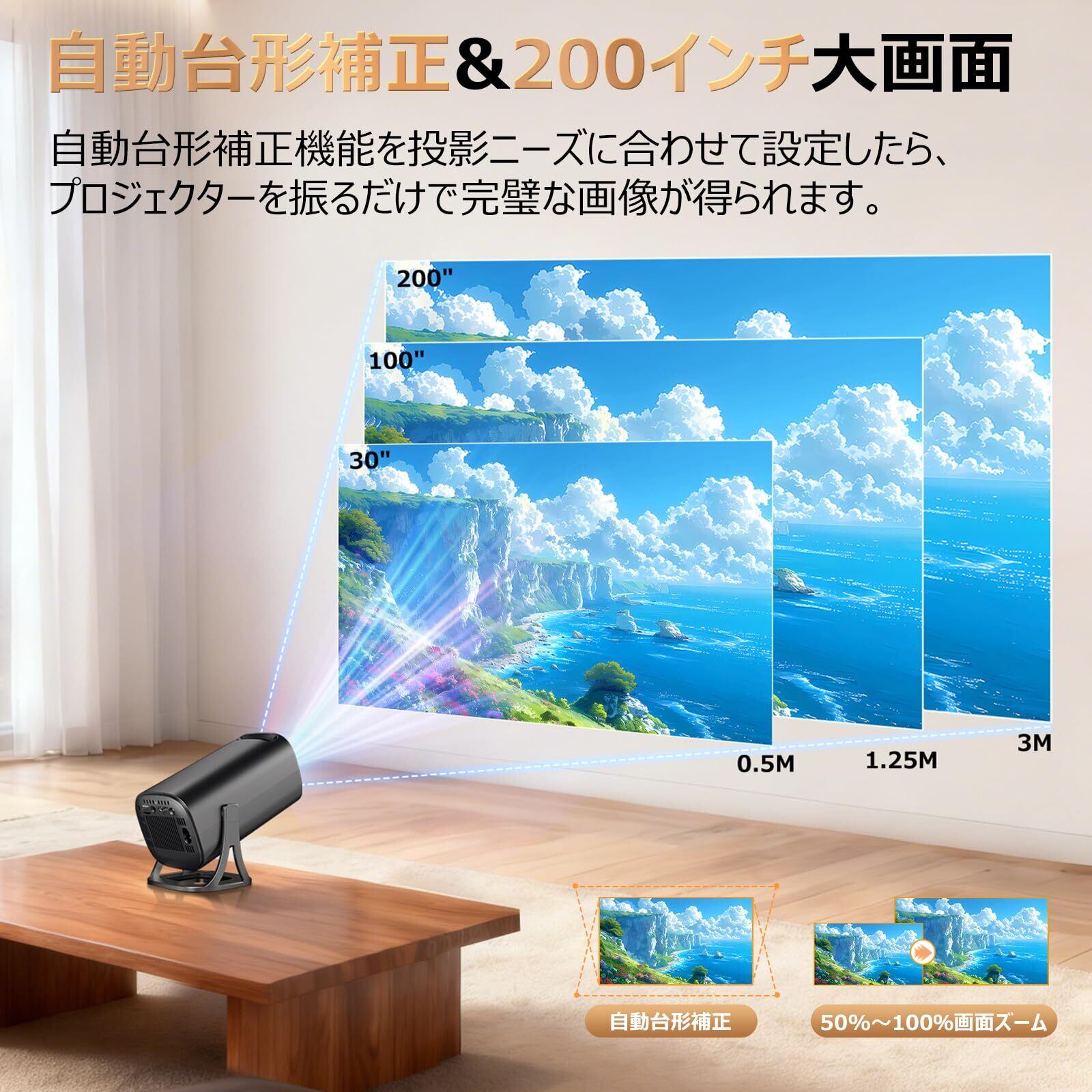 【Android TV搭載・大画面・短距離投影】このコンパクトで持ち運びに便利なホームプロジェクターは、電源コンセント、Wi-Fi、そして壁さえあれば、どんなに小さな部屋にも簡単に設置できます。Android TVを搭載し、Prime Video、YouTube、Netflix、Disney+、Hulu、TVerなど、9,000以上のアプリから60万本以上の映画やテレビ番組を家族や友人とお楽しみいただけます。また、0.5~3メートルの短焦点投射距離は、どんなに小さな部屋にも最適で、30~200インチの大画面投射もお楽しみいただけます。※鮮明な映像を確保するために、プロジェクターのフォーカスリングを回して投射距離と画面サイズを調整してください。