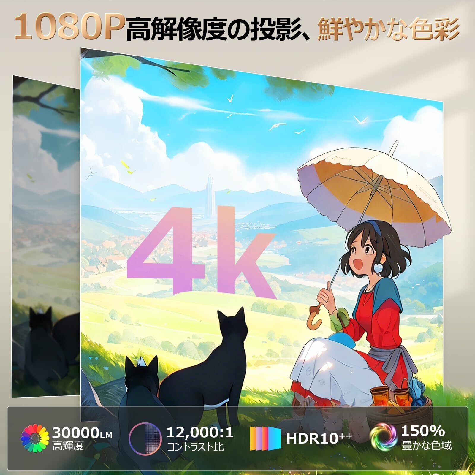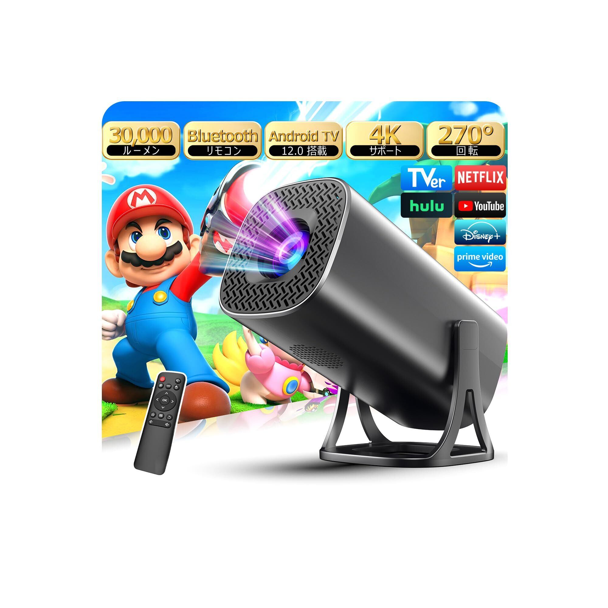 270度回転機能·天井投影対応, 30000LM 高辉度·4K対応, Android Tv 12.0搭載·Wi-Fi6瞬間接続, Bluetooth5.4·内蔵hifiスピ-カ-, Bluetoothリモコン・超静音