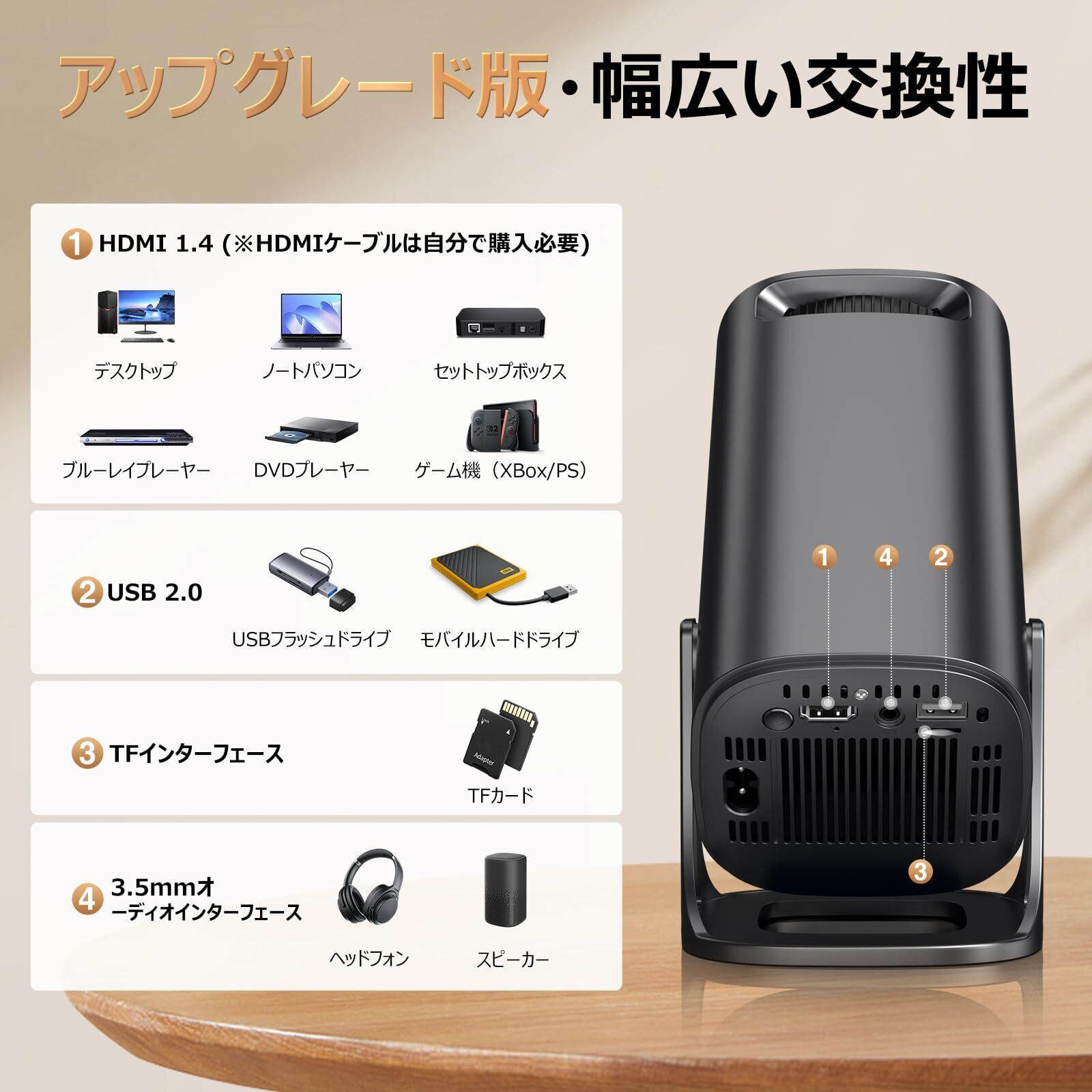 【幅広い互換性・TFインターフェース追加】無線でも有線でも接続できる家庭用プロジェクターは、Wi-Fiに接続すると、内蔵アプリを使って直接視聴できるだけでなく、スマートフォンやiPadにミラー投影して視聴することもできます。さらに、この小型プロジェクターはHDMI1.4、USB2.0、TF、3.5mmオーディオポートも搭載しており、有線接続もできます。デスクトップパソコン、ノートパソコン、セットトップボックス、ブルーレイプレーヤー、DVDプレーヤー、ゲーム機、USBメモリ、モバイルハードディスク、TFカード、スピーカー、有線ヘッドホンなど、様々な機器と互換性があります。