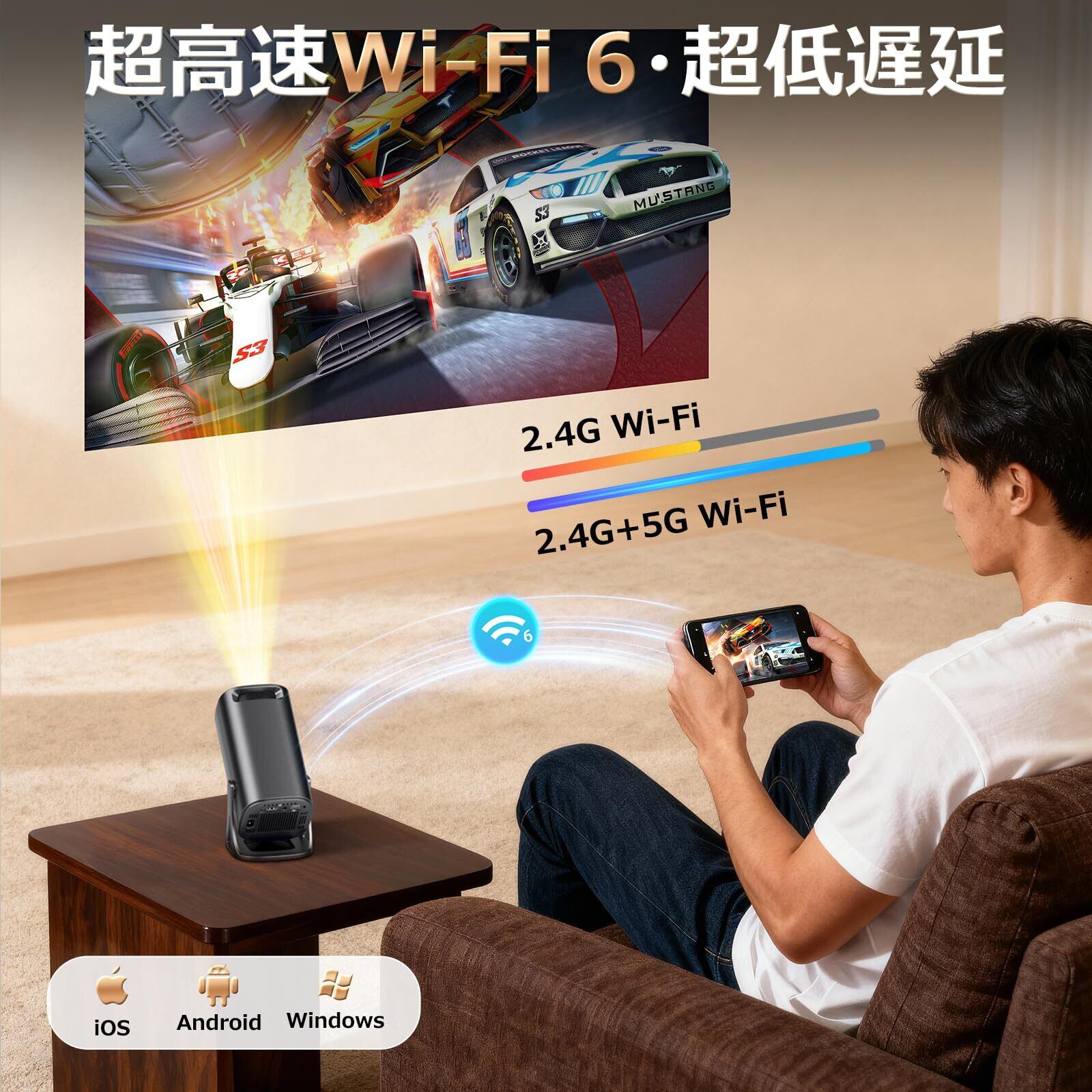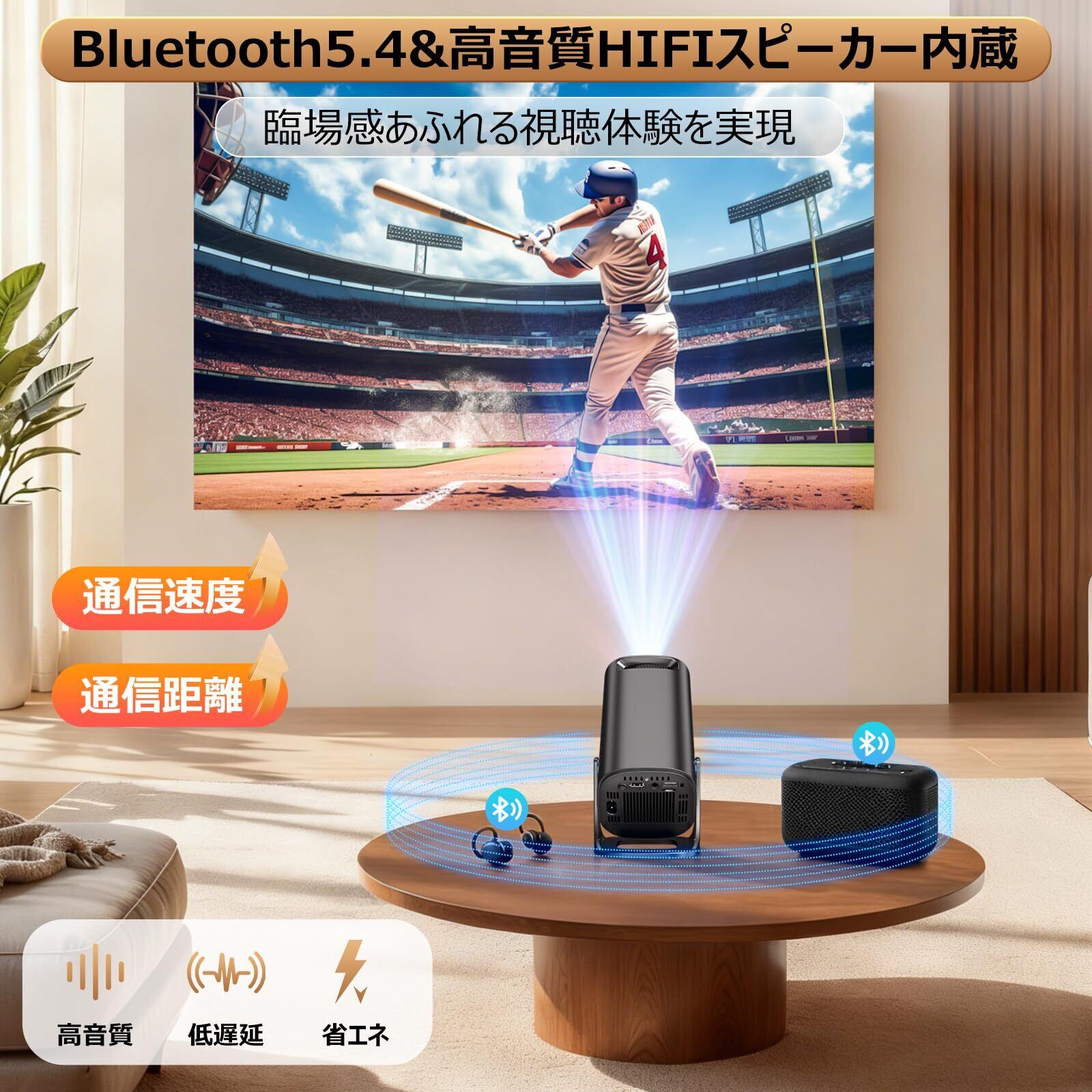 【超高速Wi-Fi 6・Bluetooth5.4・高音質HiFiスピーカー】ミニ天井プロジェクターは、独自の高精度チップ技術を採用し、超高速Wi-Fi 6接続を搭載していますので、2.4Gと5Gの両方の帯域に対応し、安定した信号と高速伝送を実現します。iOS、Android、Windowsデバイス(ミラーリング対応のスマートフォン、タブレット、デスクトップパソコンを含む)にWi-Fi経由で素早く接続し、スムーズで遅延のないオンラインゲーム、映画鑑賞、ビデオストリーミングを簡単にお楽しみいただけます。また、Bluetooth 5.4と高品質HiFiスピーカーを内蔵し、お気に入りのBluetoothスピーカーやヘッドホンからオーディオを再生することで、真に没入感のある3Dサウンド体験をお楽しみいただけます。