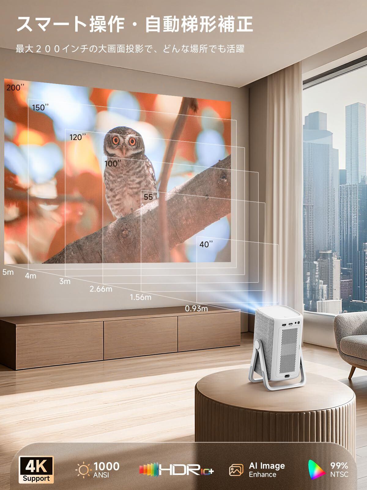 【知的自動調整でパーフェクトな視聴体験】 手動調整は不要です!AC311高輝度プロジェクターを新しい場所に移動した場合でも、AI オートフォーカス、6D キーストン補正、自動障害物回避機能により、わずか 3 秒で鮮明で正確に位置合わせされた画像を表示します。天井取り付け、側面投影、新しい場所への移動など、どのような設置方法でも、このスマートprojectorは壁の固定具や家具を回避しながら、あらゆる面に瞬時に適応します。50~100% のデジタルズーム機能により、4K プロジェクターを移動することなく画面サイズを調整できます。