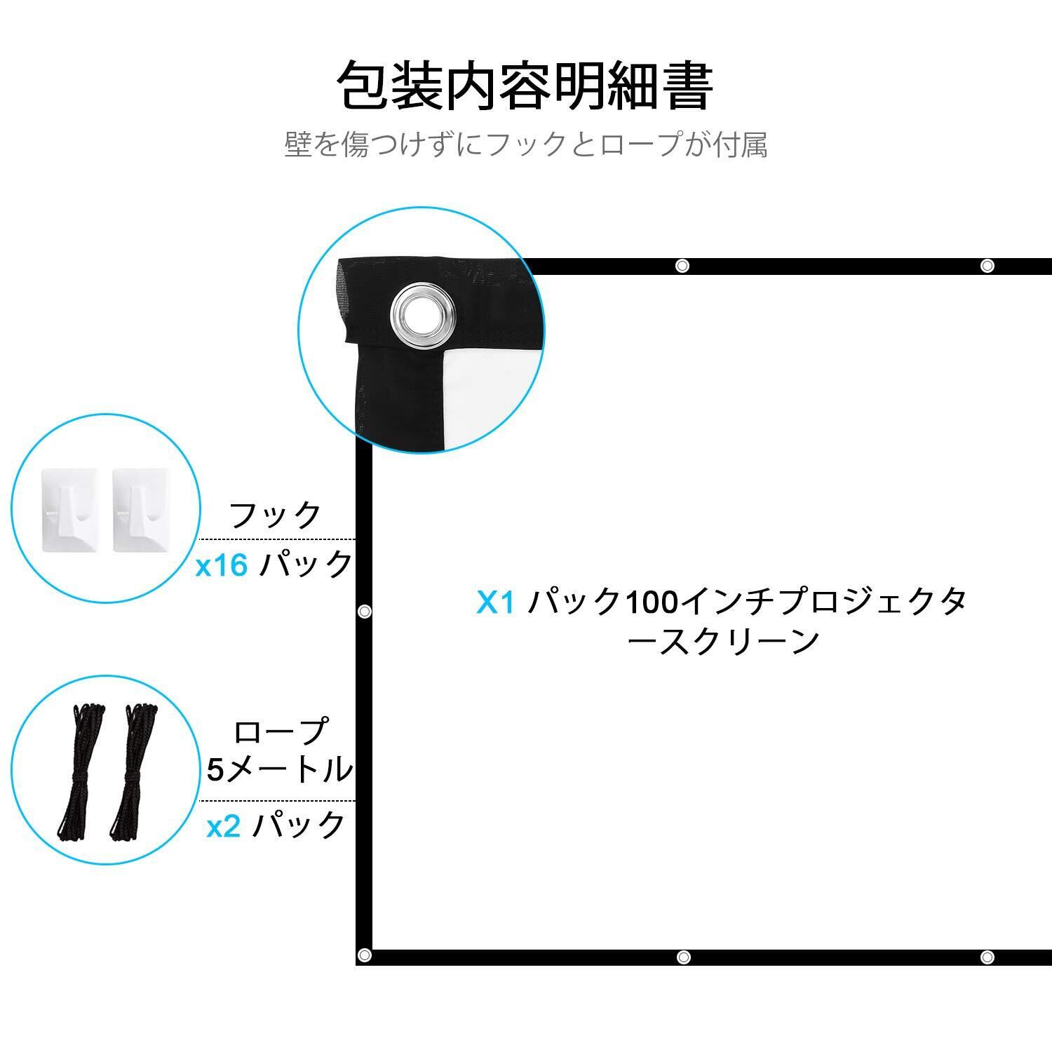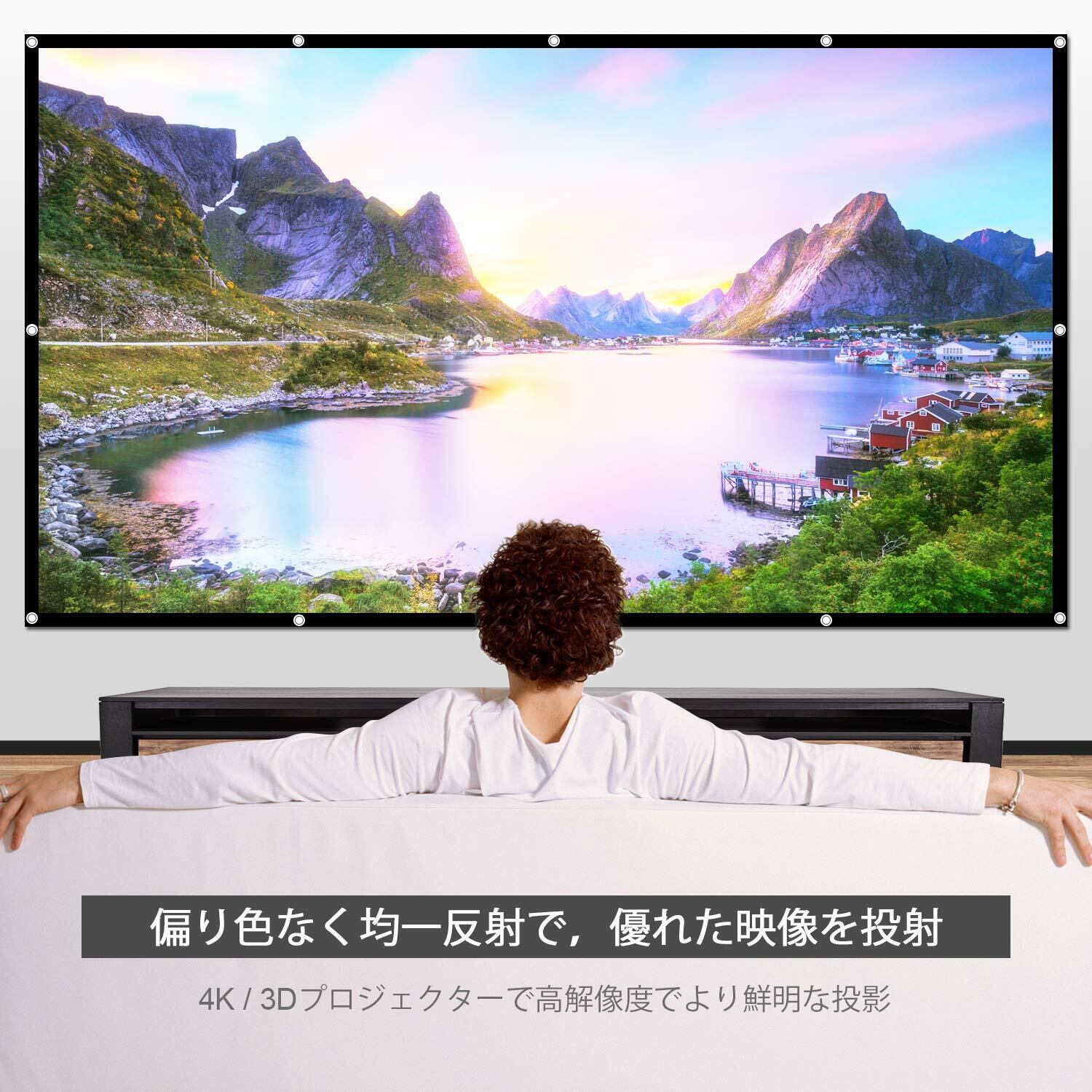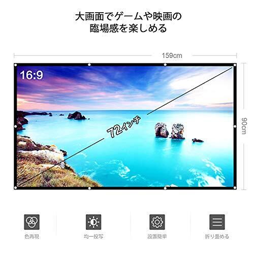 【サイズ】:72インチ・16:9、可視領域:159x90cm、重量:0.95kg。(フォックx16 5mロープx2 付き)表面素材は黄ばみや色あせを抑え、映画や動画などの画面をいつでも美しく投射できます。