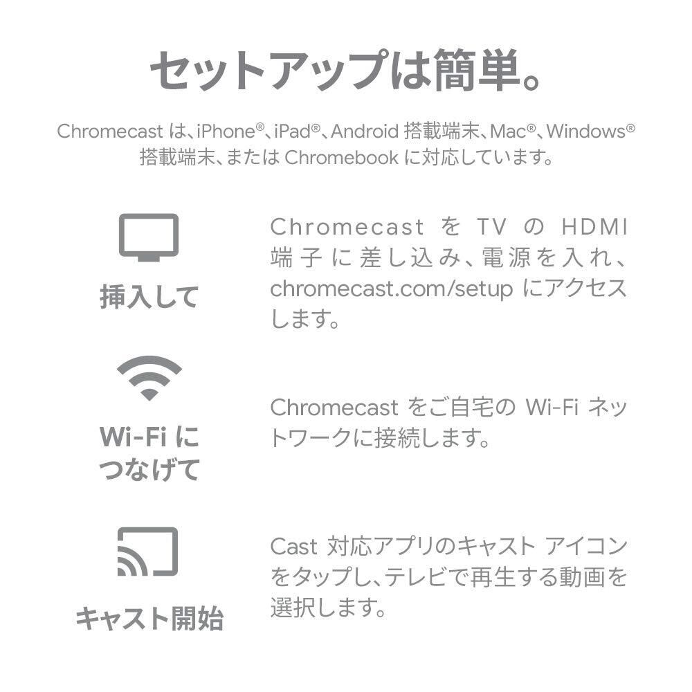 Chromecastをテレビと電源につなぎ、chromecast.com/setup にアクセスします。