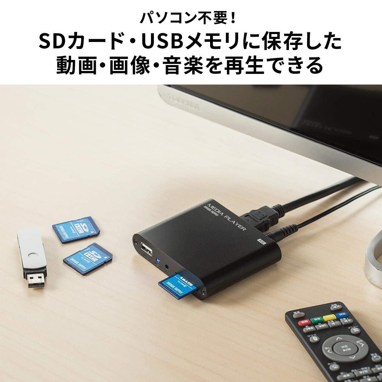 USBメモリ/SDカードに保存した動画・画像・音楽をテレビやプロジェクターで再生ができるメディアプレーヤーです。再生したいデータをUSBメモリまたはSDカードに保存し、本製品に接続することでパソコンを使うことなく再生できます。