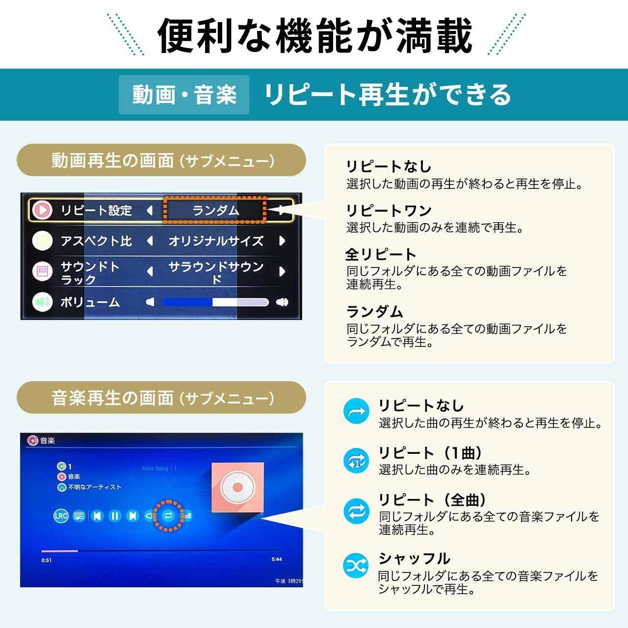 画像のスライドショー再生にも対応しています。また、動画ファイルの再生時に、メニューボタンを押すことでリピート設定などの詳細設定が可能です。