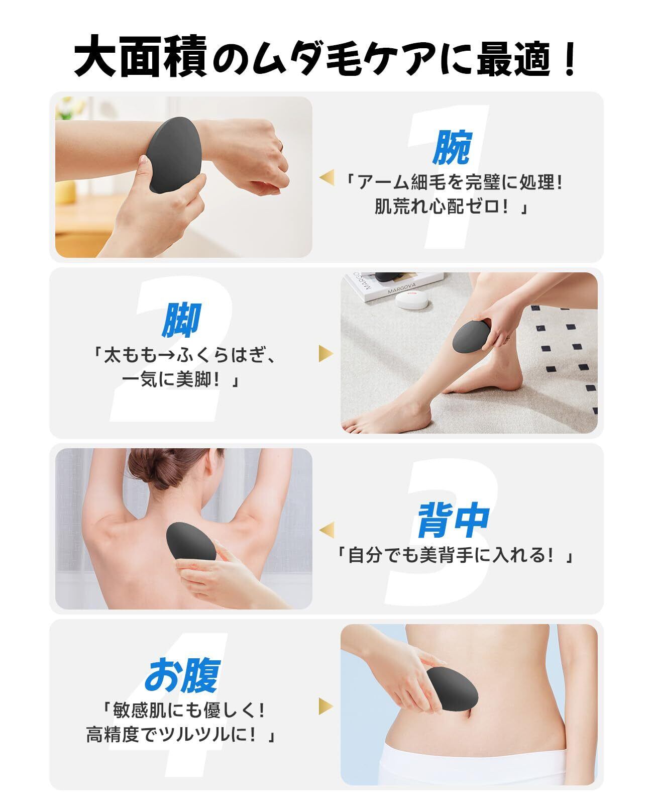【痛くない!肌への刺激なしの新世代ナノ脱毛技術】ナノガラス技術を採用し、化学成分ゼロでお肌に優しい設計。軽く円を描くようにこするだけで、ムダ毛を痛みなく除去できます。ワックスやカミソリのような刺激や黒ずみも残さず、敏感肌にも安心。サロン要らずで、手軽にすべすべ肌を実現できます。※同じ箇所を長時間使用しないでください。
