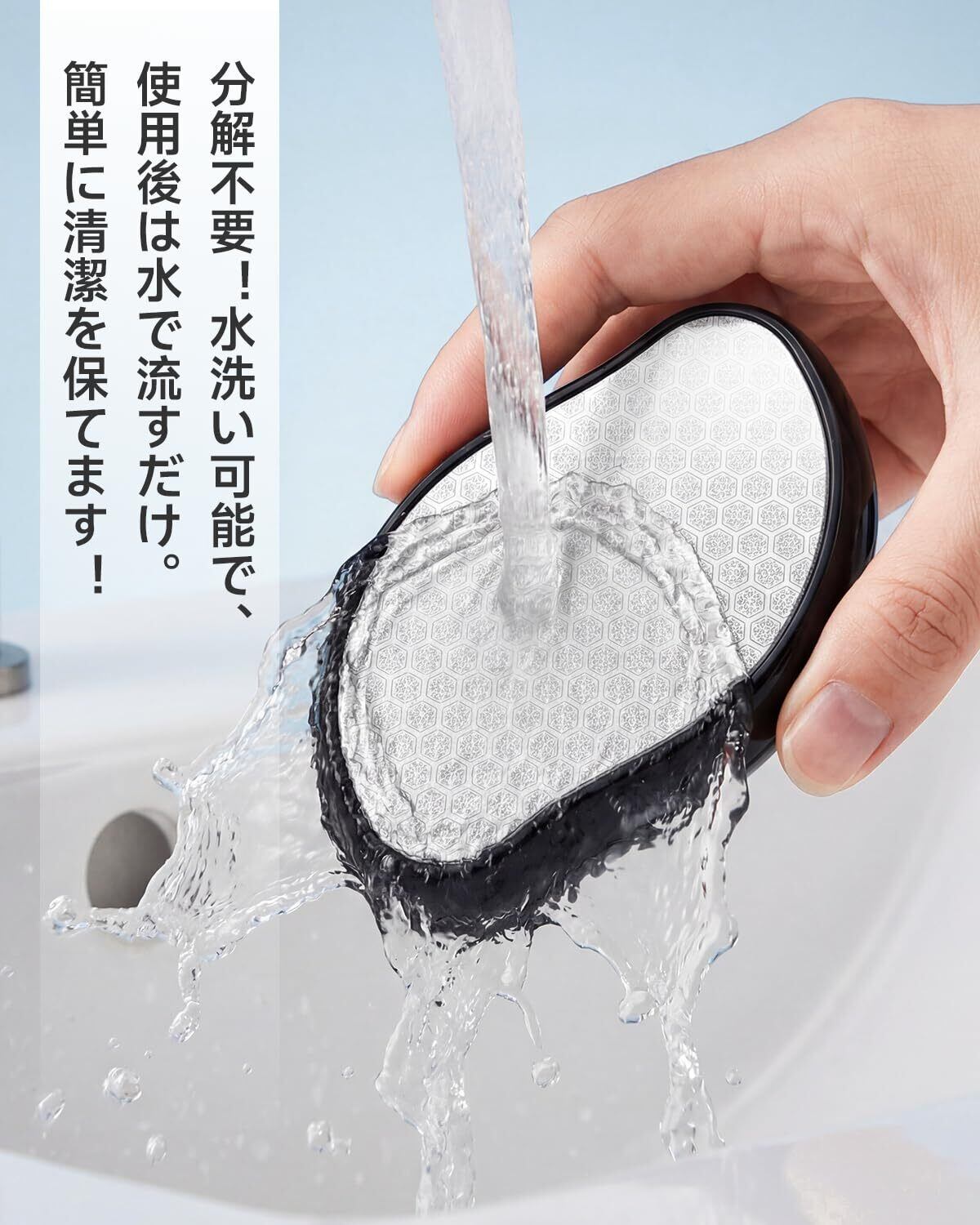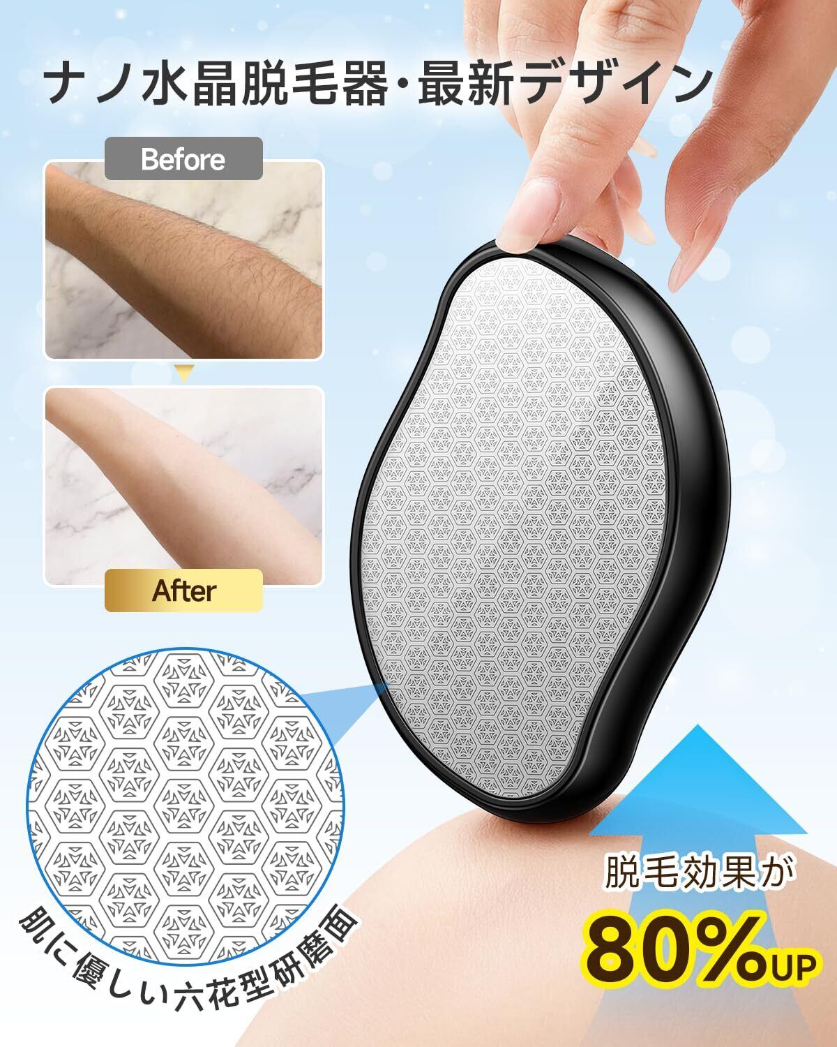 ✨【脱毛と角質ケアを同時に行う「Wスムース設計」】 製品表面の微細なナノ粒子構造は、ムダ毛を根元から取り除くだけでなく、古い角質をやさしくポリッシュする効果も備えています。市販の粗い研磨材とは異なり、肌への負担を最小限に抑えた滑らかな質感が特長です。太もも、ふくらはぎ、二の腕、お腹など、全身の気になる部位でお試しいただけます。わずか10秒ほどの軽いケアを続けることで、毛の目立たない、透明感のあるなめらかな素肌へと導きます。