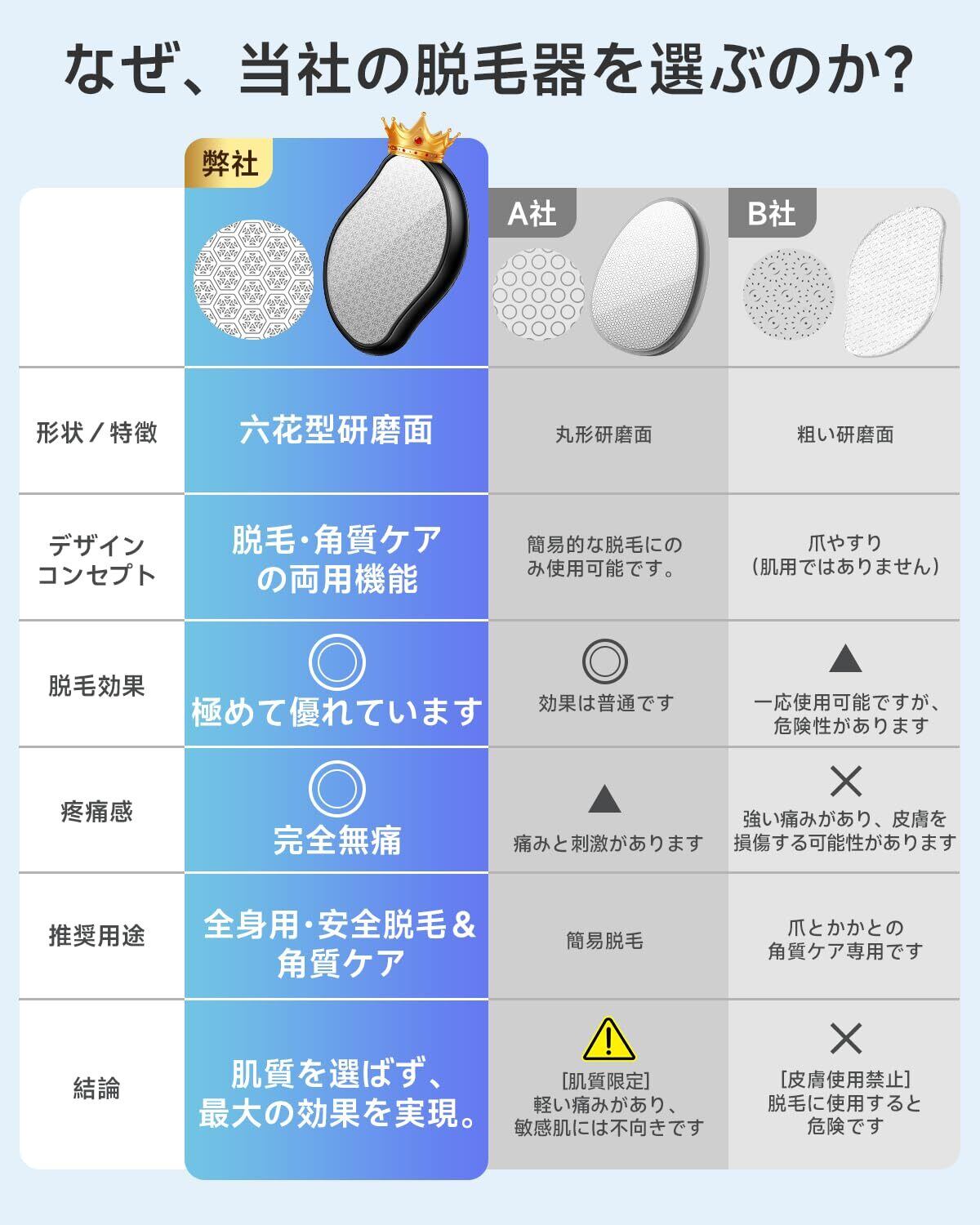 【新感覚・ナノ接触式脱毛:肌に触れるだけで、摩擦抵抗を感じさせない「究極の無痛ケア」を実現】 従来のワックスやカミソリ、光脱毛器とは異なるアプローチ。高度に研磨されたナノガラス表面が、毛幹を包み込むようにからめ取り、肌そのものをこすらずに処理します。化学成分・熱・光は一切使用せず、敏感肌の方や、刺激による赤み・黒ずみが気になる方にも安心してお使いいただけます。サロンに通う時間も費用も、痛みやダウンタイムも一切不要。ご自宅で、日常的に、心地よいお手入れをお楽しみください。