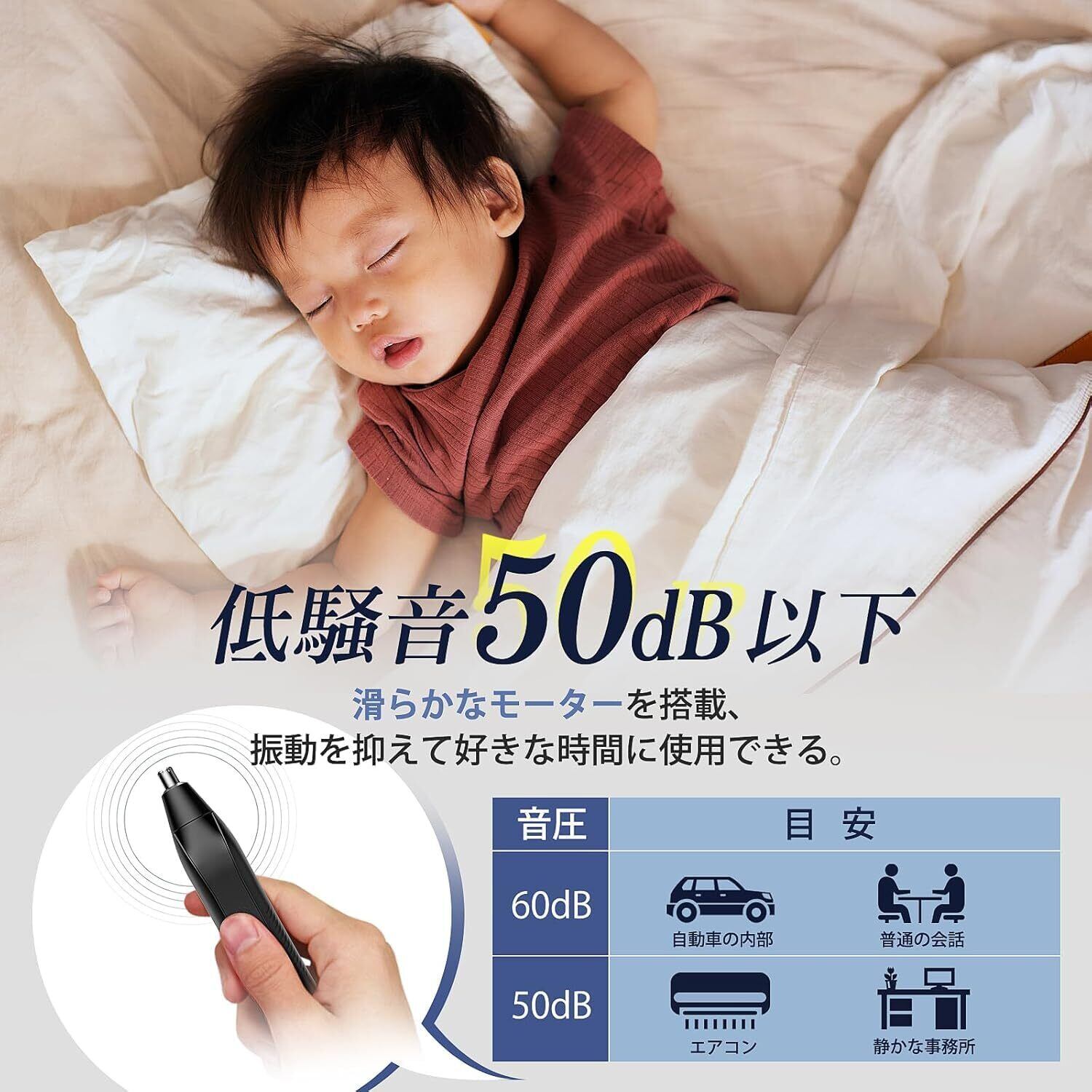 【低騒音・優れた切れ味】動作音50dB以下の静かなモーターを搭載、高速回転刃で切れ味がよく、引っ張らずに鼻毛・耳毛・眉毛を簡単に処理します。耐久性よいABS樹脂と精鋼ステンレスを使用し、環境に優しい。鼻毛カッターはポケットサイズで省スペースかつ軽量です。いつもフレッシュで自信に満ちたあなたをキープします!