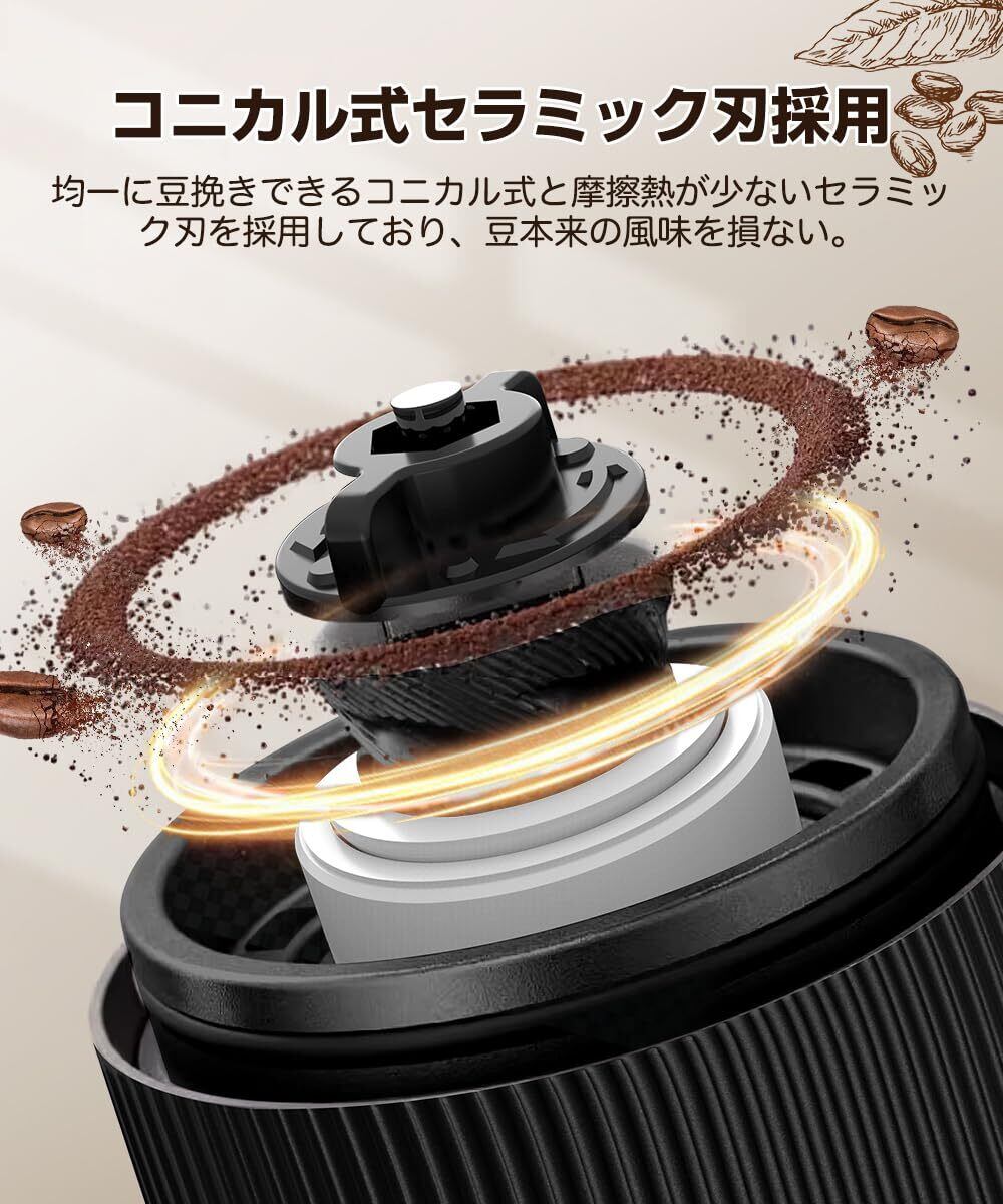 コーヒーミル 電動電動コーヒーミル コードレス 臼式 コニカル式 セラミック刃 コーヒーグラインダー Type C充電式 粗挽き 細挽き 粒度調整 自動停止 水洗い可能 小型 コンパクト 操作簡単 お手入れ簡単 掃除ブラシ付 日本語取扱説明書 ブラック