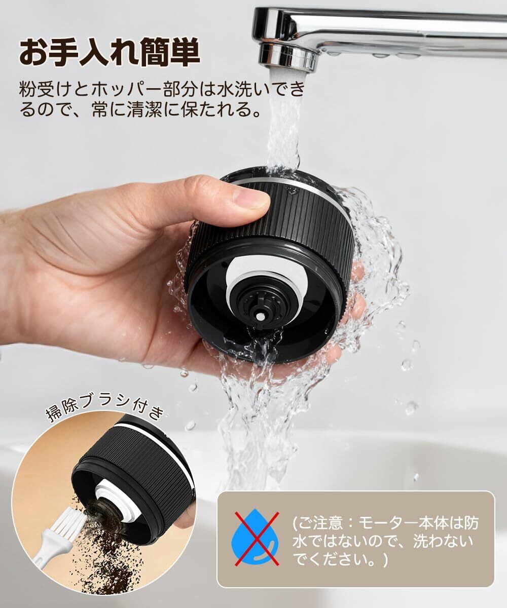 【操作簡単&お手入れ簡単】コーヒーミルはボタン1つのシンプルなデザインで、初心者からプロまで気軽に操作できます。ただ3ステップで簡単に研磨頂けます。①コーヒー豆をカップに入れます。②蓋を閉めます。③お好みの粒度を選んで、電源スイッチをオンにします。そして、コーヒーミルのお手入れも簡単で、粉受けとホッパー部分は水洗いできるので、常に清潔に保たれます。(ご注意:モータ―本体は防水ではないので、洗わないでください。)また、専用の掃除ブラシが付属しており、製品の掃除が更に楽になります。