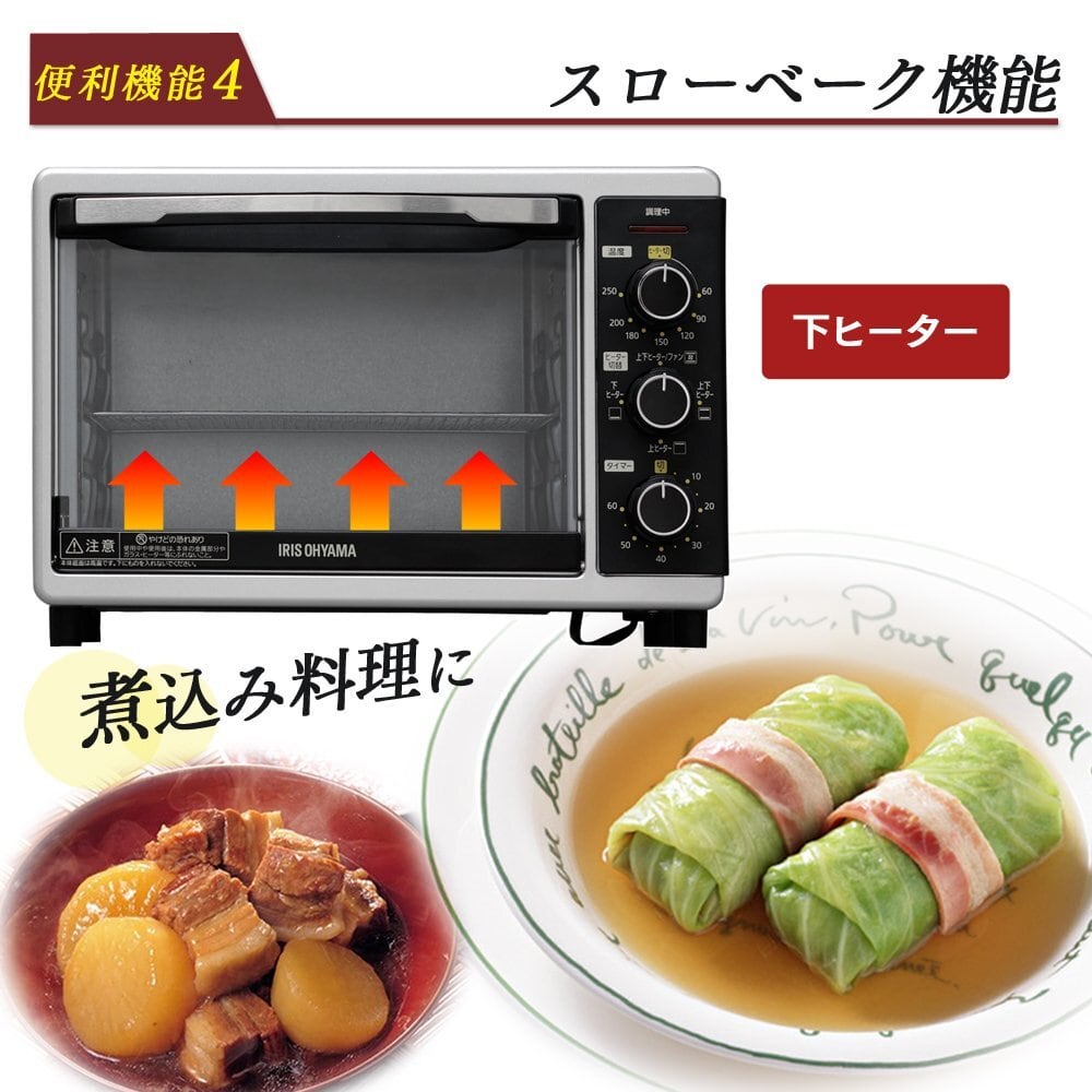 【1.コンベクションオーブン機能】 表面をカリッと焼き上げるオーブン調理や、ノンフライ調理ができます。油で揚げずにヘルシーなフライや揚げ物を簡単に作れるので、健康重視の方におすすめです。保温に適した60度の設定も可能で、食材を柔らかく包み込むように、じっくりと熱を加える調理に便利です。<おすすめ料理>グラタン・揚げ物・ケーキ等。【2.オーブン機能】上下のヒーターで、トーストなどがムラなく焼き上がります。しっとりとした食感に作り上げたい料理におすすめです。 <おすすめ料理>トースト・蒸し焼き等。【3.グリル機能】上部からのヒーターのみで、一気に表面を焼き上げることができます。こんがりと焼き目をつける料理に向いています。<おすすめ料理>焼き魚・焼き鳥等【4.スローベーク機能】食材にじっくり火を通したい時に下火だけで加熱できます。調理の最後の仕上げにも使える便利機能です。<おすすめ料理>:煮込み料理等
