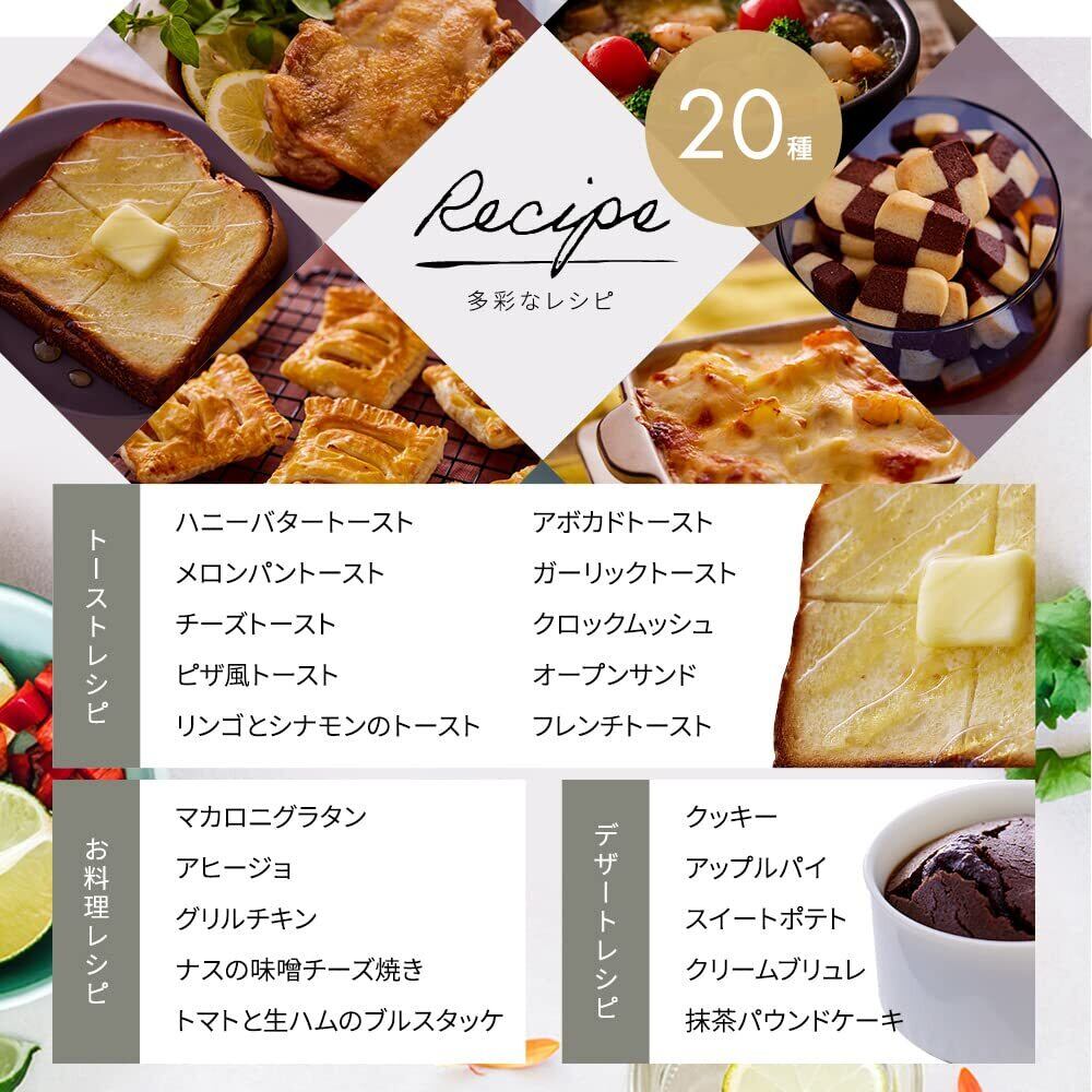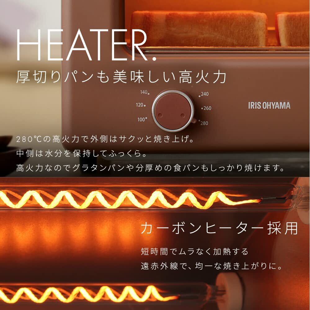 【ふんわり柔らかスチーム機能】中はもっちり、外はサクサク!!付属のスチーム用カップをセットし、あたため開始を押すだけで、蒸気の力で食パンをさっくりふんわり焼き上げます。【表面を素早くさっくり焼き上げ】ツマミを回せばすぐに暖め開始でき、4枚のトーストも約3分で焼き上がります。忙しい朝にもとても便利です。さらに、カーボンヒーターを採用しているため、遠赤外線のおかげで短時間で、素早く表面をムラなく加熱します。【厚切りパンも美味しい高火力】280℃の高火力で外側はサクッと焼き上げ。中側は水分を保持してふっくら。高火力なのでグラタンパンや分厚めの食パンもしっかり焼きあげます。
