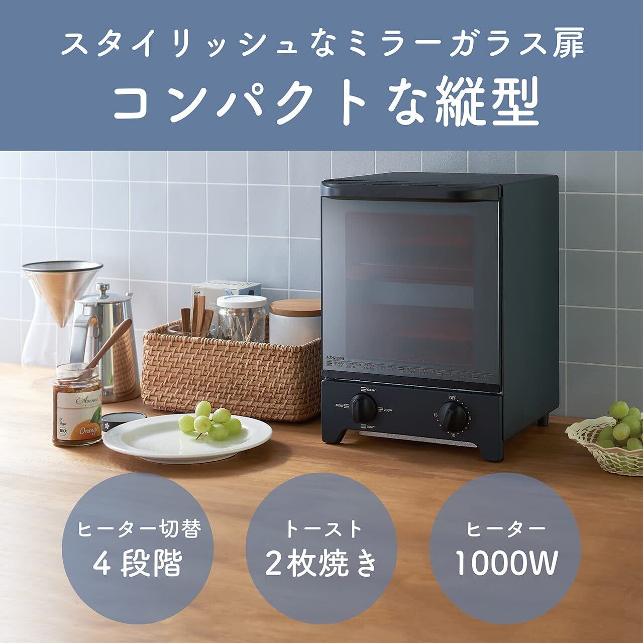 コイズミ オーブントースター 縦型 1000W ヒーター切替4段階 2枚焼き ミラーガラス扉 ブラックKOS-1031/K