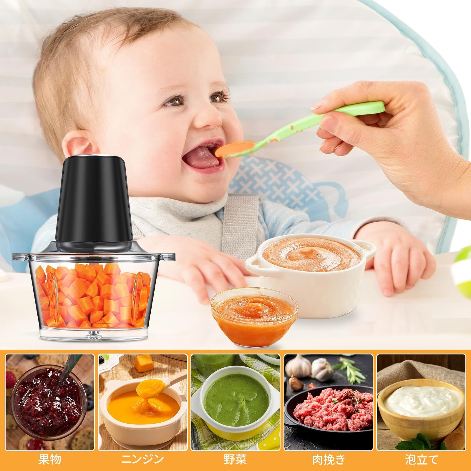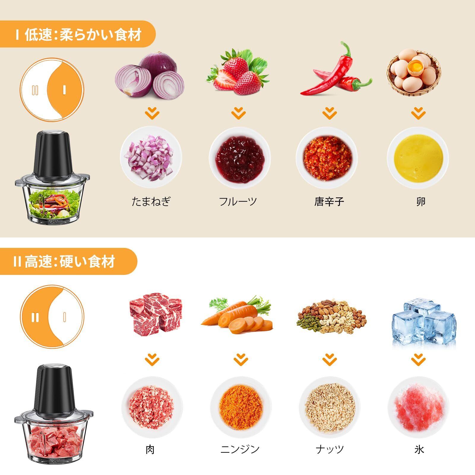 【1台5役】離乳食やミルクセーキ、カキ氷様々な料理を作れる, ペットフードもOK、2L大容量, 過熱保護、お手入れ簡単、肉挽き/野菜切り/ミキサー、 滑り止めゴム, 交換… 表示を増やす