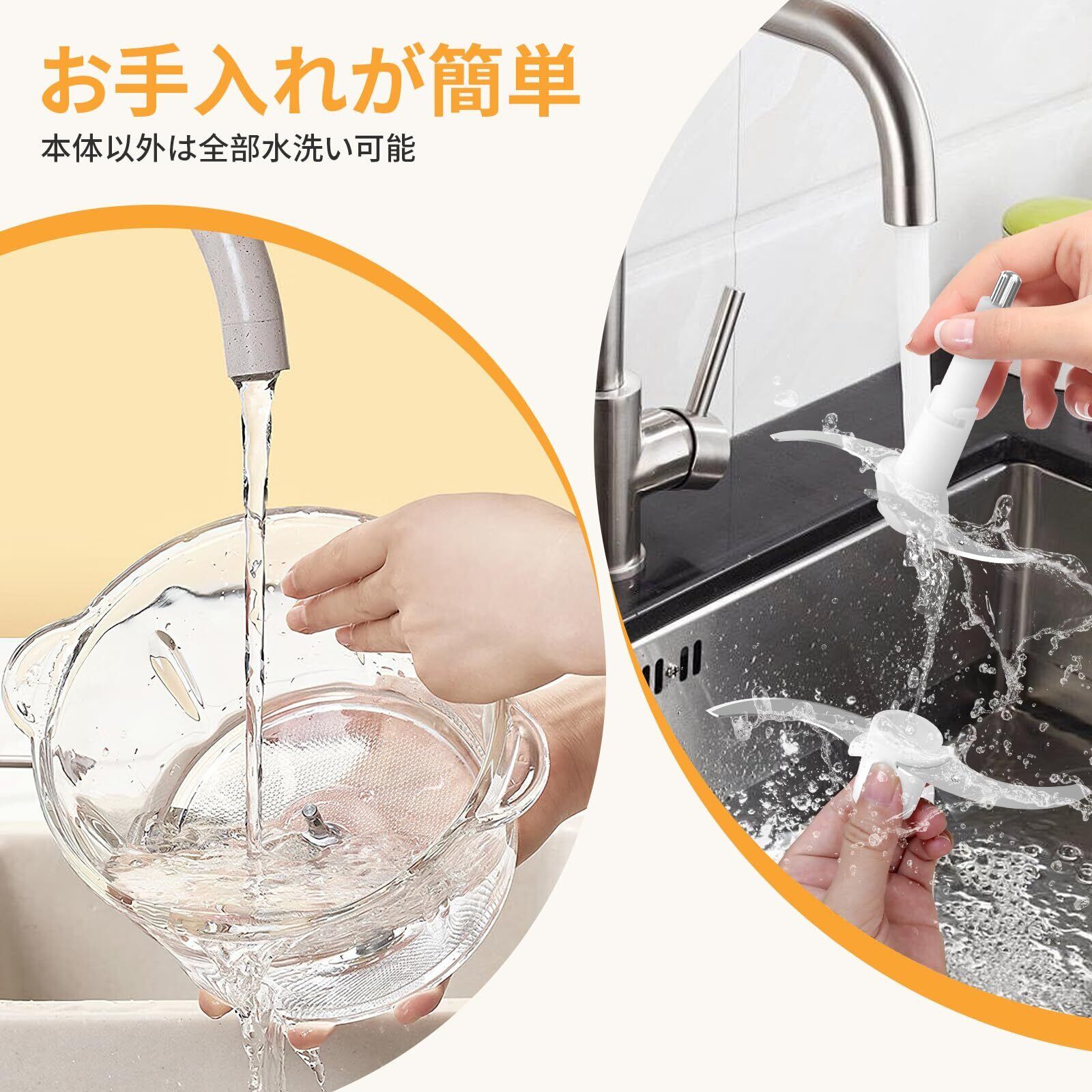 【安全保護&水洗可能】フードプロセッサー 小型は、加熱保護や誤作動防止の安全装置を搭載しており、すべての部件が正しくセットした後のみ動作します。モーター以外の容器、カッターと蓋は丸洗いできて、いつも清潔な状態を保つことができます。ボトルの底にシリコンコースターが付いてますので、稼動中にも安定!アタッチメント類がすべて容器の中に収まるため、収納スペースに限りがある一人暮らしの方にもおすすめです。