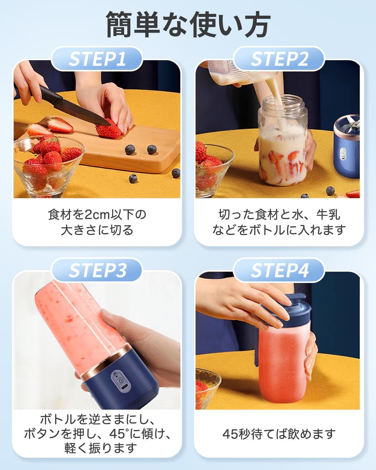 【ご注意事項&間】①充電しながらの使用はおやめください。②食材を1.5CM以下の大きさに切ってから入れて、適量の水や牛乳を加えて起動してください。 ③使用する前に、本体とボトルはきちんと設置されることを確認してください。*④食材がボトルの3分の2を超えないようにし、45°傾斜してジューサーを軽く揺らし、できるだけブレードが空気に十分に触れるようにしてください。製品は間品質期間が付いてるので、もし使用中に何かの問題がありましたあら、是非お気軽にお問い合わせください。