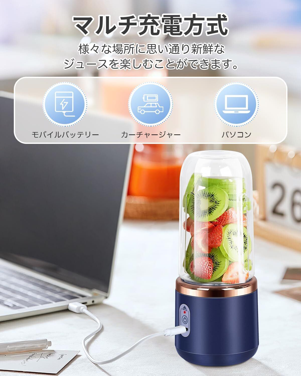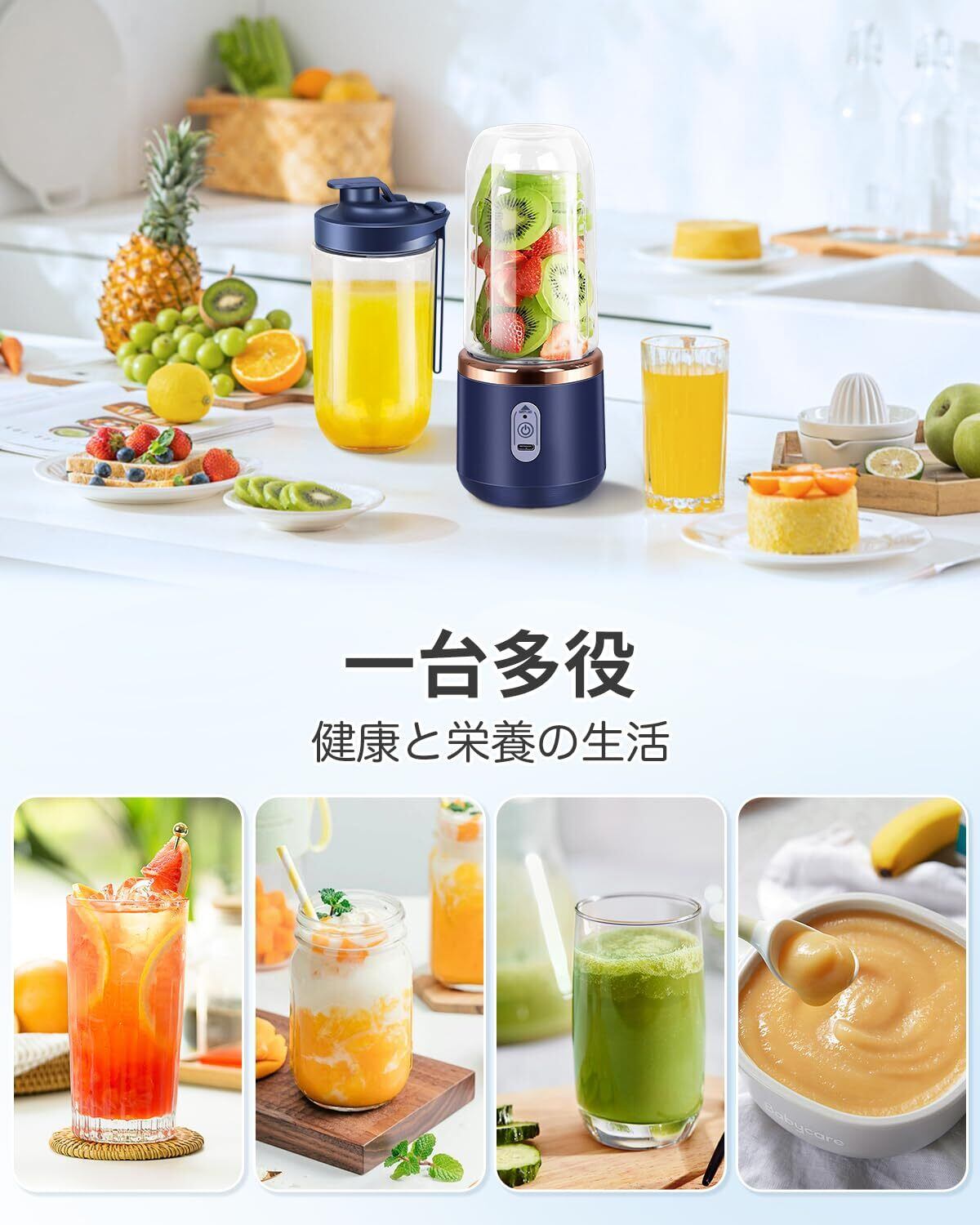 ジューサー ミキサー 果物 野菜 ジュース 離乳食用 栄養補充 一台多役 コードレス 22000回/分高速回転 400ML*2大容量コップ Type-C充電式 小型 ミニ 一人用 持ち運びやすい お手入れ簡単 出張/旅行/オフィス/アウトドア (ダークブルー)